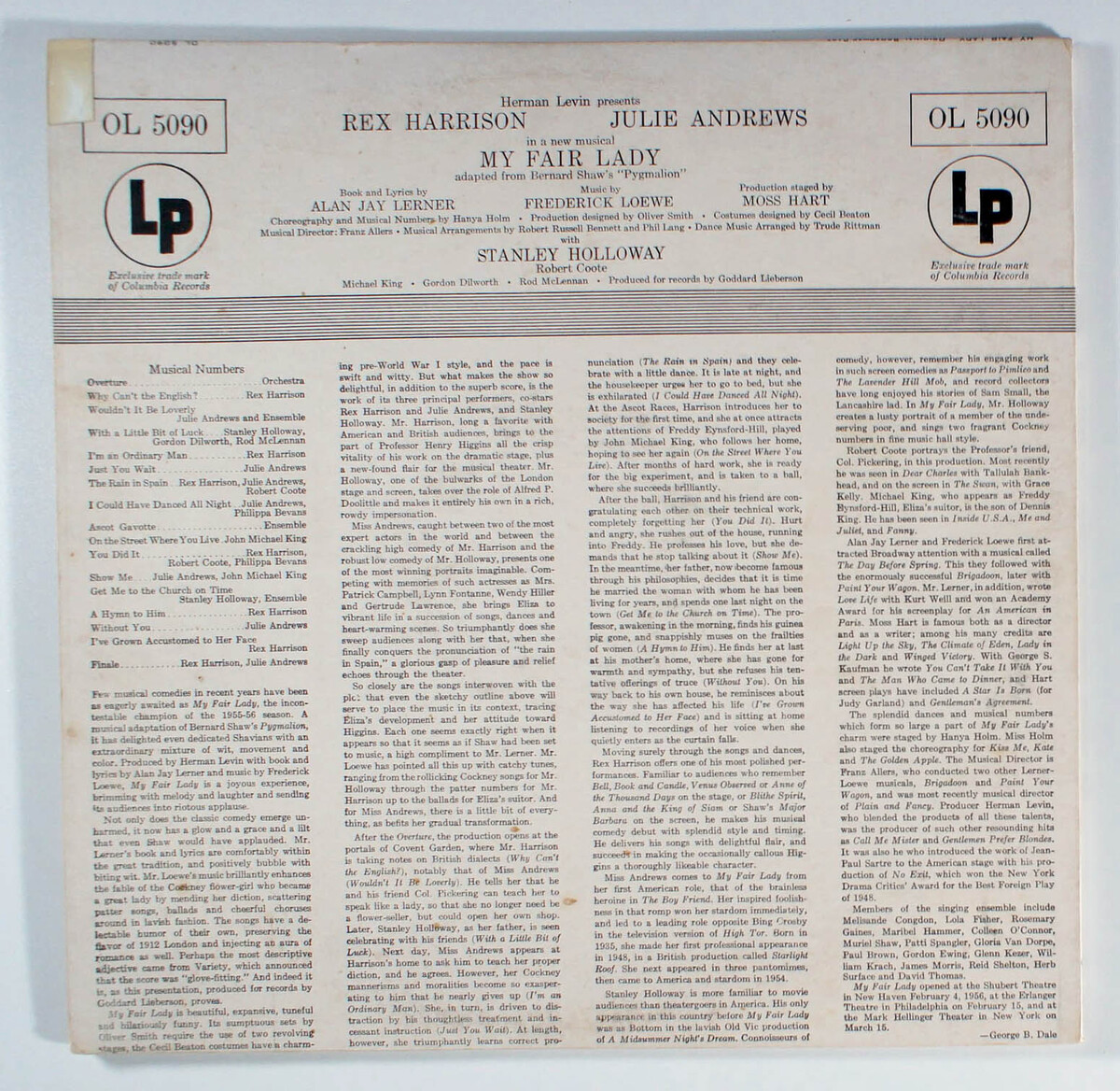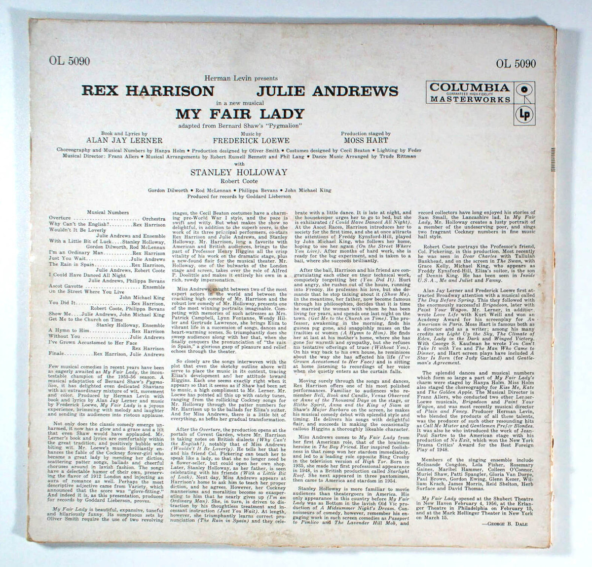 My Fair Lady features the Broadway cast of the popular musical based on George Bernard Shaw's 1913 play Pygmalion, with a book and lyrics by Alan Jay Lerner and music by Frederick Loewe. The story concerns Eliza Doolittle, a Cockney flower girl who takes speech lessons from professor Henry Higgins, a phonetician, so that she may pass as a lady. Despite his cynical nature and difficulty understanding women, Higgins falls in love with her. The musical's 1956 Broadway production was a notable critical and popular success, winning six Tony Awards, including Best Musical. It set a record for the longest run of any musical on Broadway up to that time and was followed by a hit London production. Rex Harrison and Julie Andrews starred in both productions. Many revivals have followed, and the 1964 film version won the Academy Award for Best Picture.