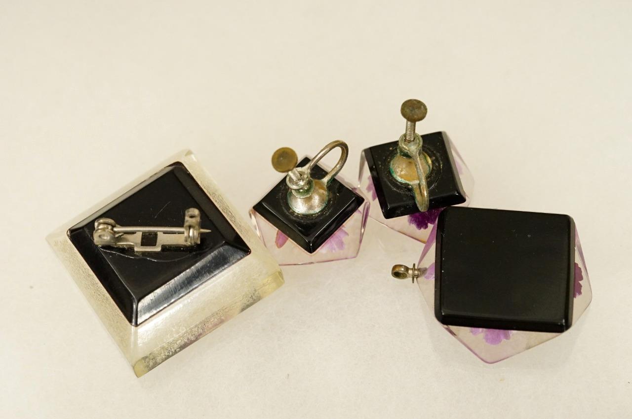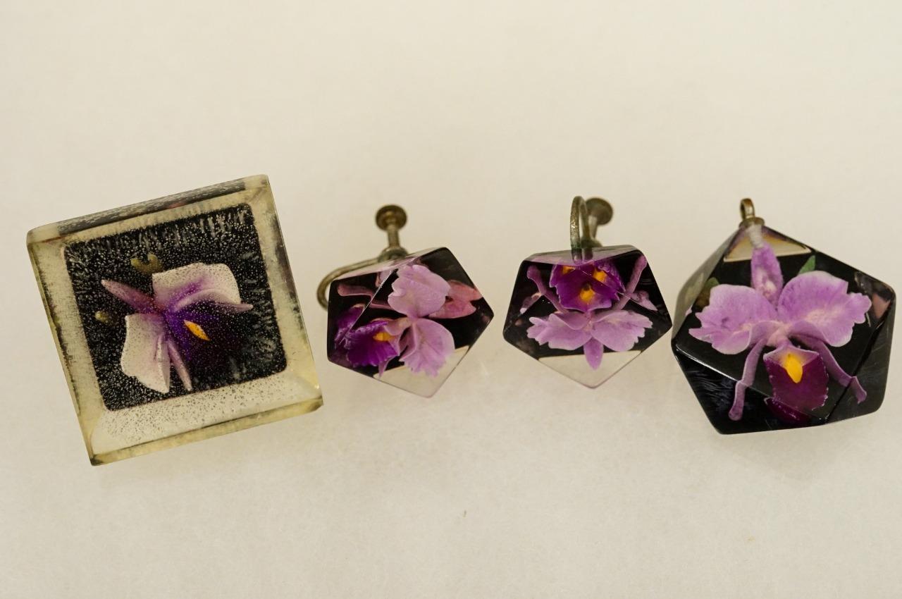 Vintage Hawaii Estate Jewelry Orchid Flower Carved Lucite Tone Purple Brooch Set, Pendant, earrings and pin. The earrings are screwback in style. The pin is 1-1/8" square as a size reference. Nicely detailed. Hawaii origin. 1950-60s era souvenir piece.
