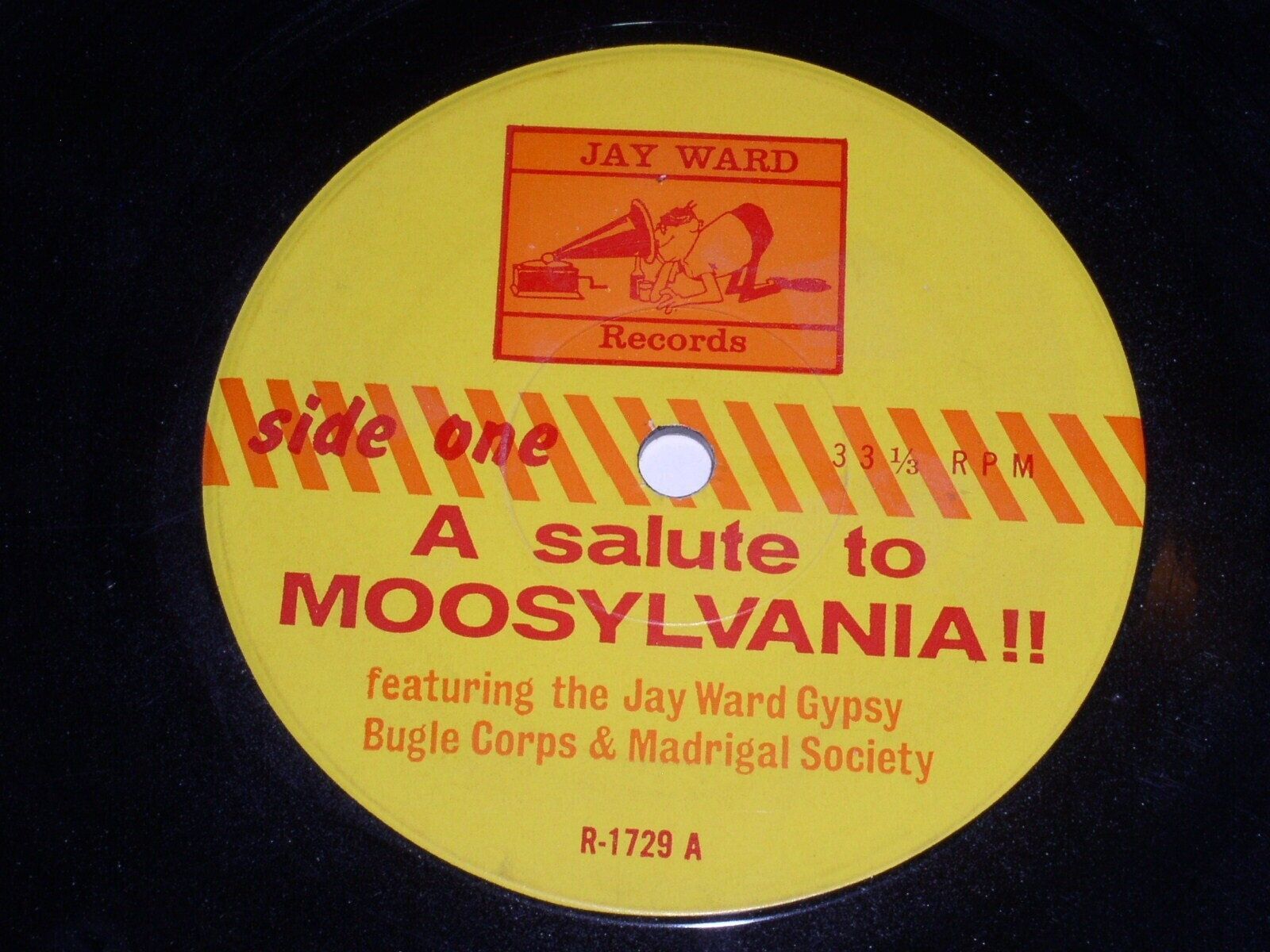 This is a vintage 33 1/3 rpm phonograph record by Jay Ward, entitled, "A Salute To Moosylvania!!". Flipside, "A Salute To Moosylvania!!. Record label Jay Ward Records R-1729. There is no picture sleeve with this.