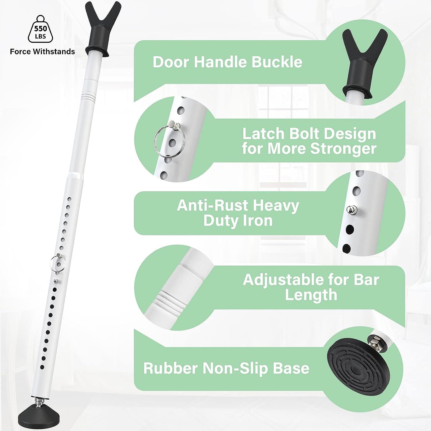 ?Lock Bolt Design, Double Safety Protection?Under the adjustable function, we have added the bolt bolt function, which makes the sill bar stronger and more indestructible. ?Anti-Slip Base?The rubber base on the bottom prevents the bar from slipping off the door or scratching the floor. The swivel round base ensures full contact with the floor for a secure fit and is effective against slipping. ?Sturdy Quality, Safe and Anti-Theft?This heavy-duty sliding door security bar is made of high-grade iron and can withstand 550 lbs of pressure. It prevents forced entry to hinged, patio and sliding doors for added home protection. ?Easy to Use?The props under the door handle are easy to disassemble, and the anti-theft lever can also be easily adjusted. Safety bars are easy to install and use is a breeze. ?Adjustable, Multi-Scenario Use?The door safety bar can be adjusted from 28" - 45" for application flexibility. The door safety bar is adjustable and multifunctional designed to fit most standard doors, patio sliding doors, windows, front doors, back doors, patio doors, apartments, hotel rooms and more. ?WHAT'S INCLUDED? Your satisfaction matters, so enjoy lifetime support. Door Safety Bars (2 pcs), Door Covers (2 pcs), Sliding Patio Door Window Covers (2 pcs), User Guide.