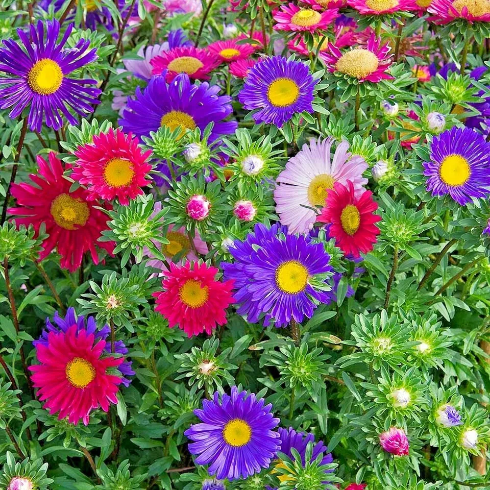 GIANT CALIFORNIA / CHINA ASTER Singles mix. California / China Aster is one of the most popular long lasting, cut flowers available. Easy to grow from seed. The single blooms are about 3" across and resemble chrysanthemums. They get about 24"tall. This mix comes in pastel colors of reds, pinks, blues and lavenders with bright yellow centers. Blooms from early summer into fall. Garden or patio container. 300+ seeds per order. Thank You!