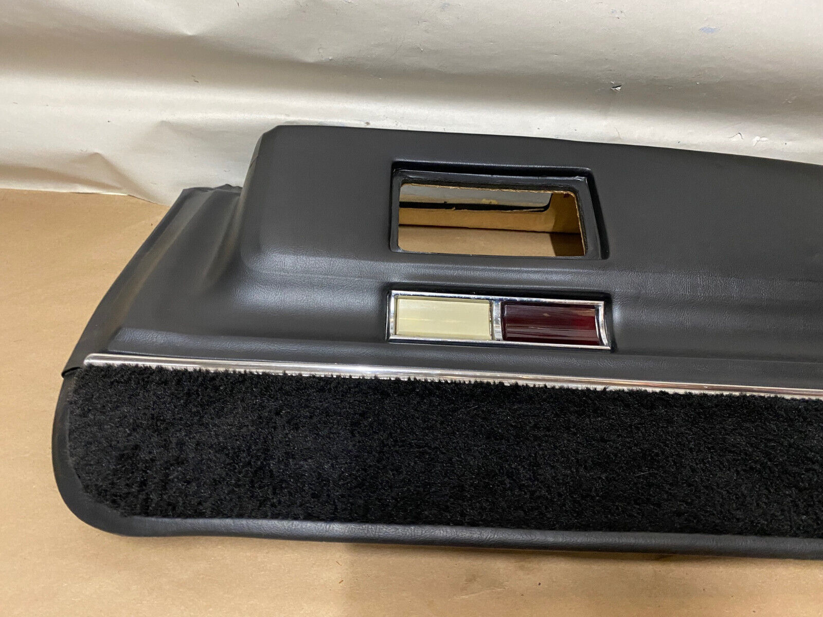 OEM passenger side rear lower door panel is in good driver quality condition. Vinyl is intact, no cracks, has a couple dimples from sitting on the shelf on top of other panels that should work its way out with the sun load in the car, but overall very minor. The carpet is in good condition. The lower portion os the cardboard backer has some water damage in the one corner. Courtesy light is