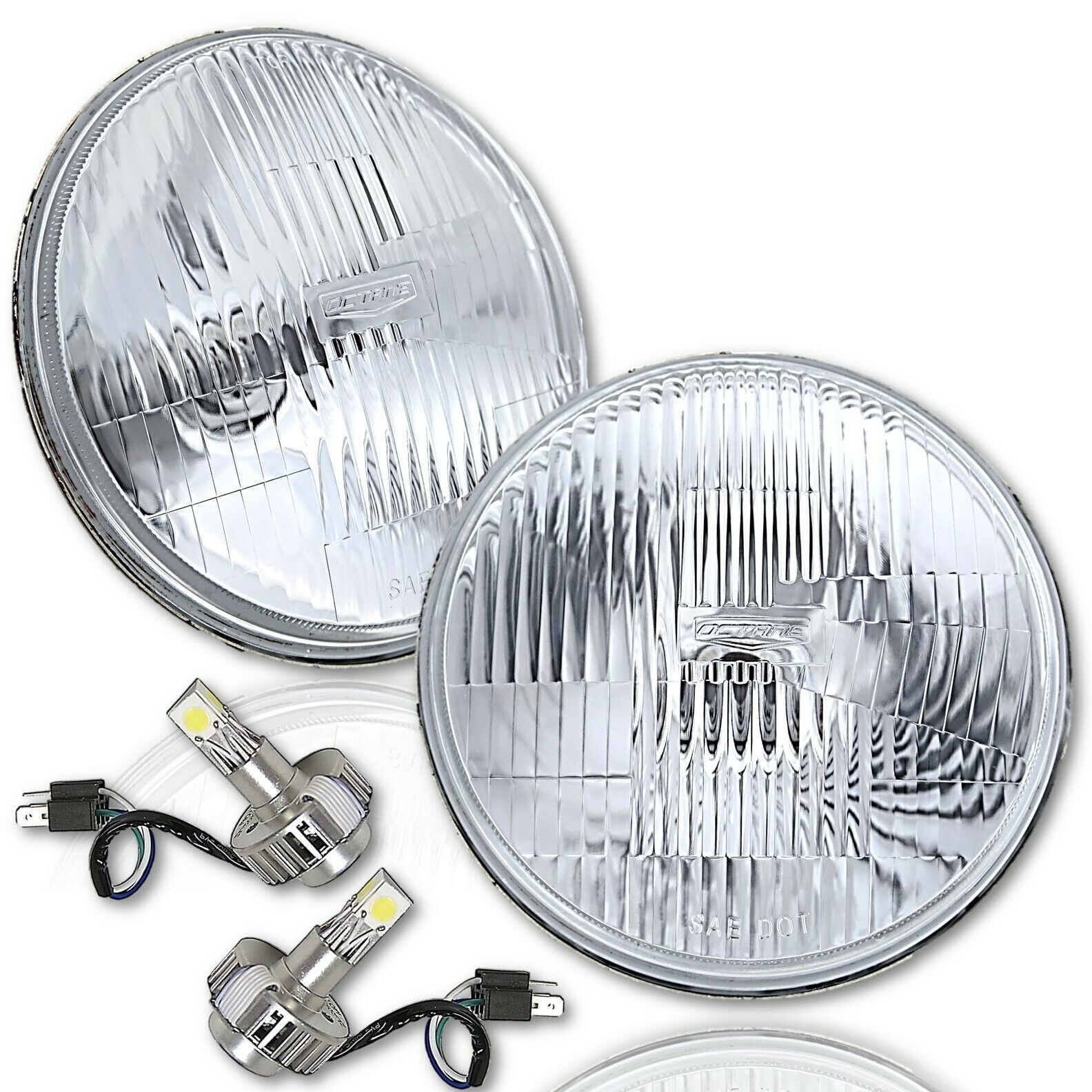 7" Stock Glass Lens/Metal Headlight LED 6K 18/24w H4 Light Bulb Headlamp Pair
