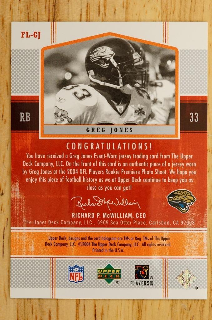2004 Upper Deck Future NFL Legends Greg Jones FL-GJ Rookie Patch Football Card. Raw and Ungraded. No smoke or pet odor.