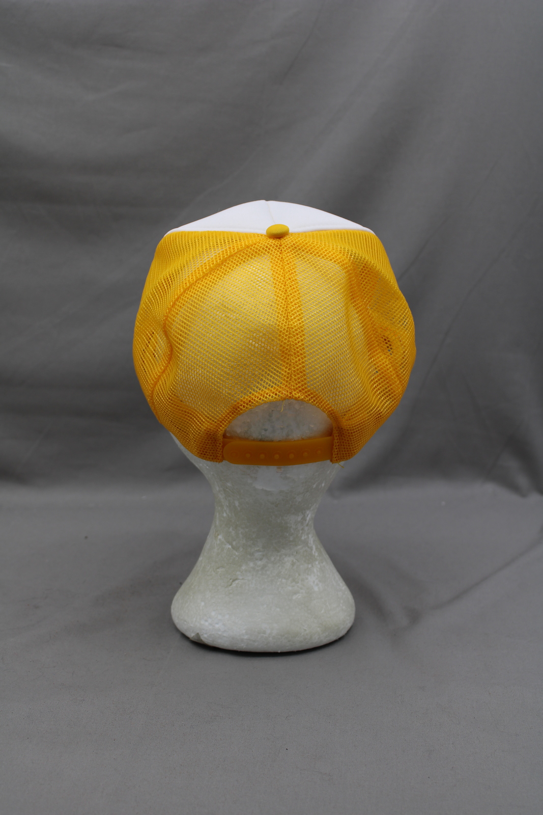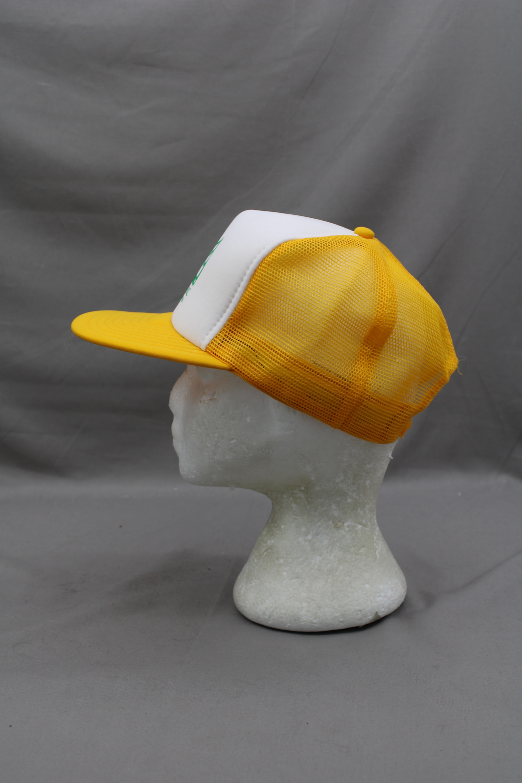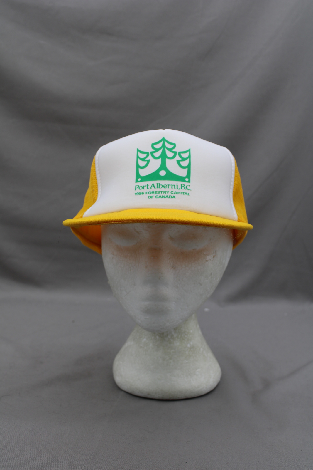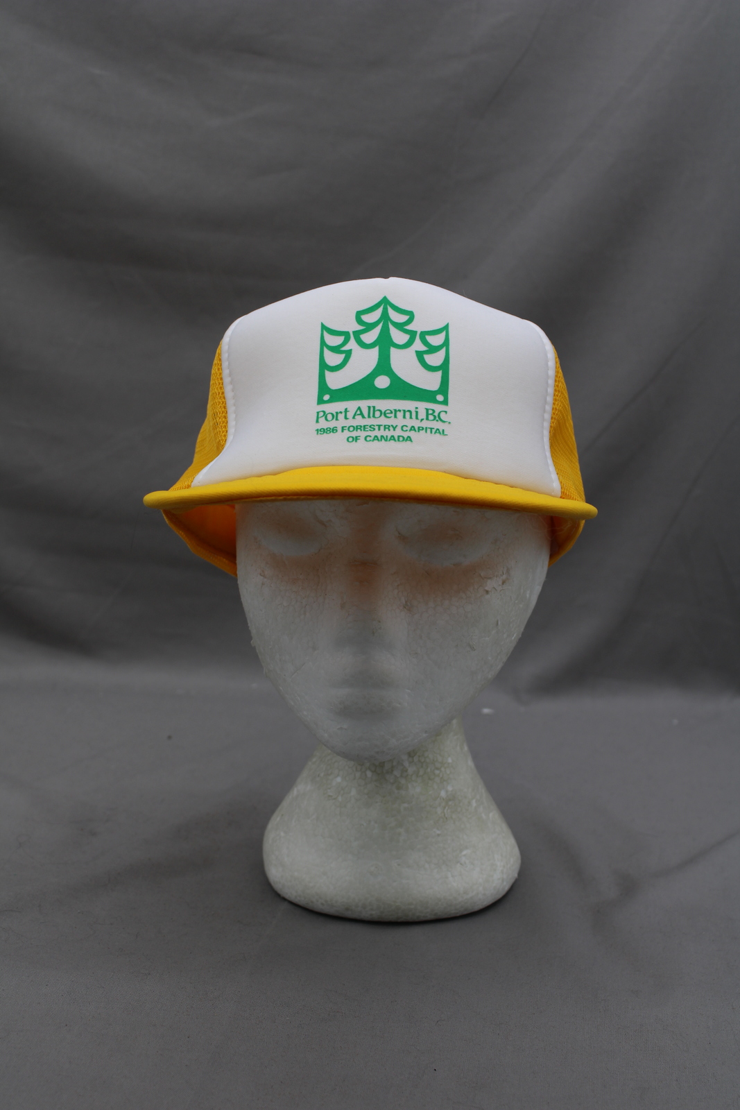 Up for sale is a vintage screened trucker hat. It has a yellow base colour with a white front. The front of the hat has a logo of a pine tree screened on with Port Alberni 1986 Forestry Captial of Canada underneath. What a great vintage hat do not miss out on it.