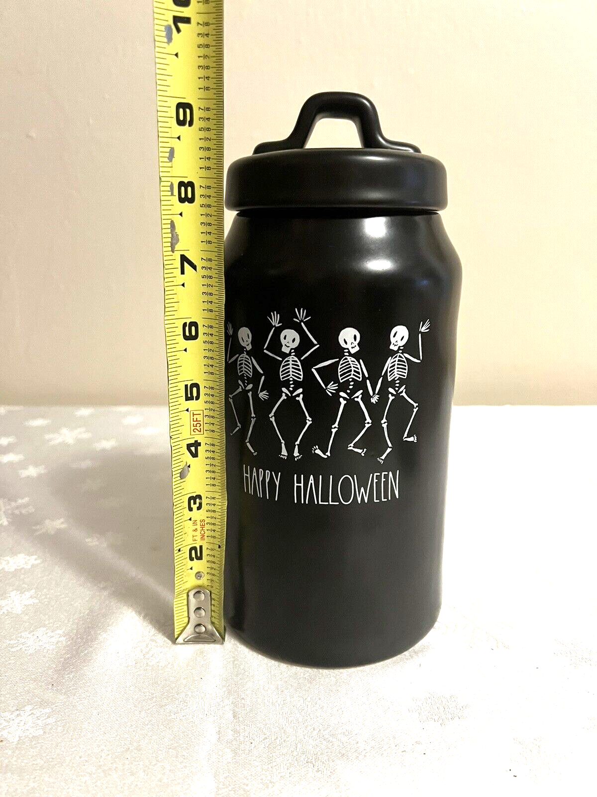 This Rae Dunn canister is the perfect addition to your Halloween decor. The black ceramic material with white letters features a spooky dancing skeletons pattern that will add a festive touch to any room. Use it to store your favorite treats or simply display it as a decorative piece. This canister is hard to find and makes a great gift for any Halloween lover.