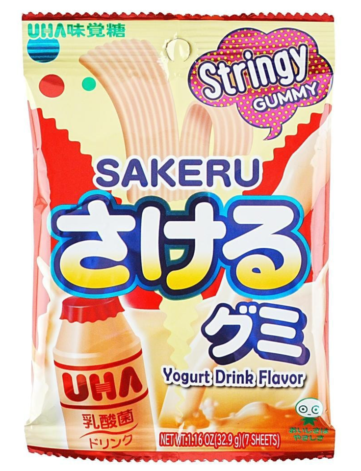 Sakeru Gummy is a delightful Japanese gummy candy that comes in both short and long strips. "Sakeru" in Japanese means split. Although Sakeru Gummy is sometimes mistaken for "gum," it is actually a gummy candy that you can separate before eating, or "sakeru." The candy is usually sold in packs of small rectangular sheets that are divided into several pull-apart strips, similar to string cheese. These strips have ridges, allowing you to tear them, share them, or play with them before eating. The gummy candy melts in your mouth and comes in a variety of fruity flavors. The most popular flavors of Sakeru Gummy include orange, peach, yogurt and grape, which are widely enjoyed in Japan.