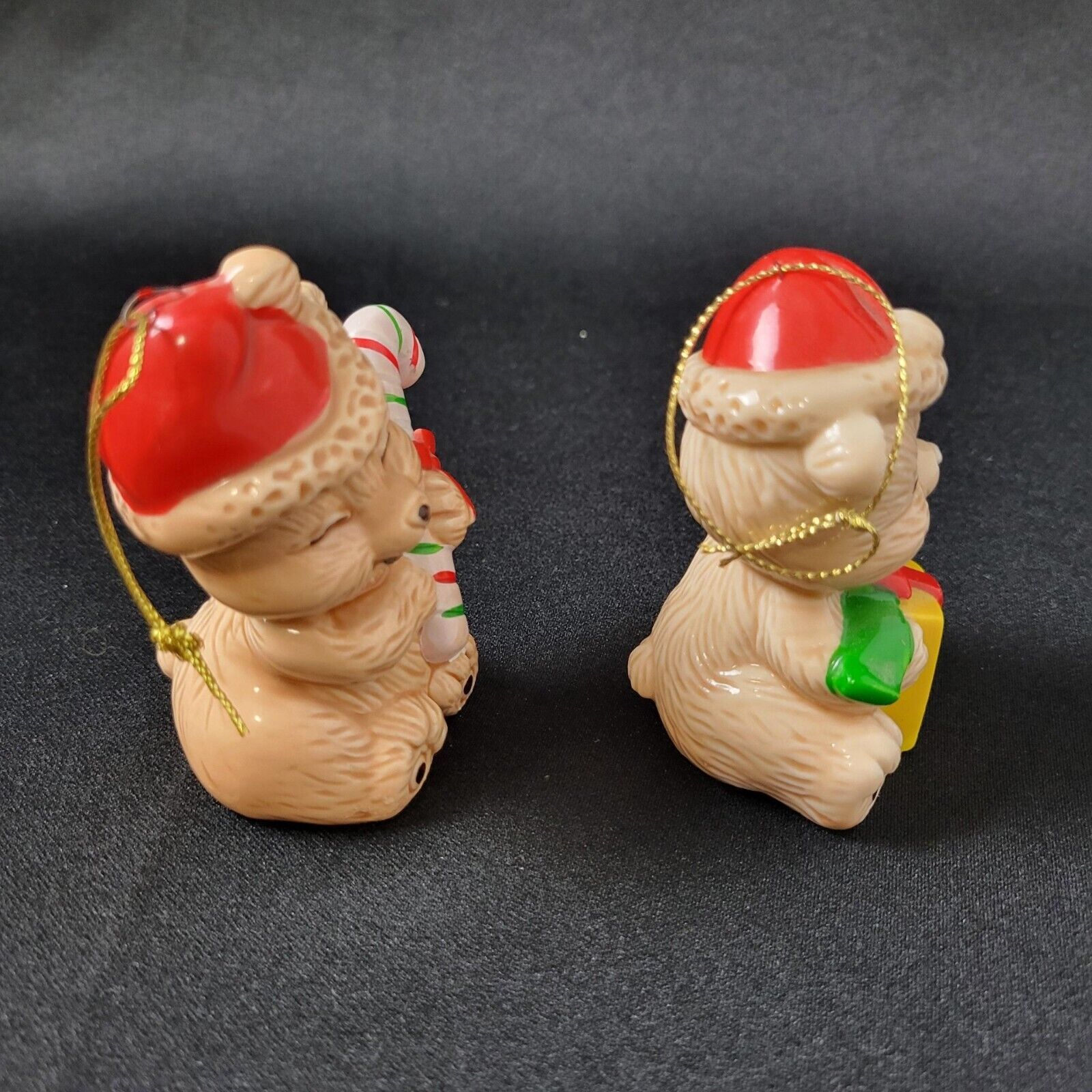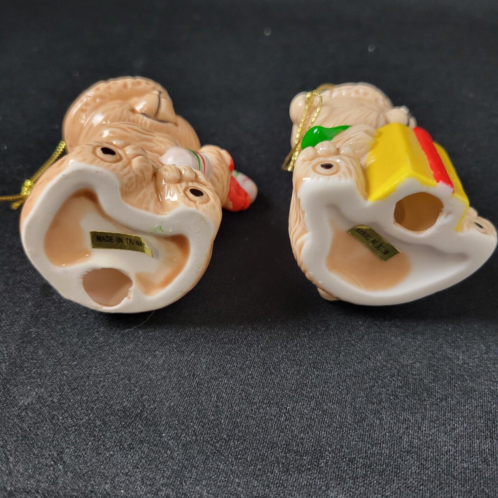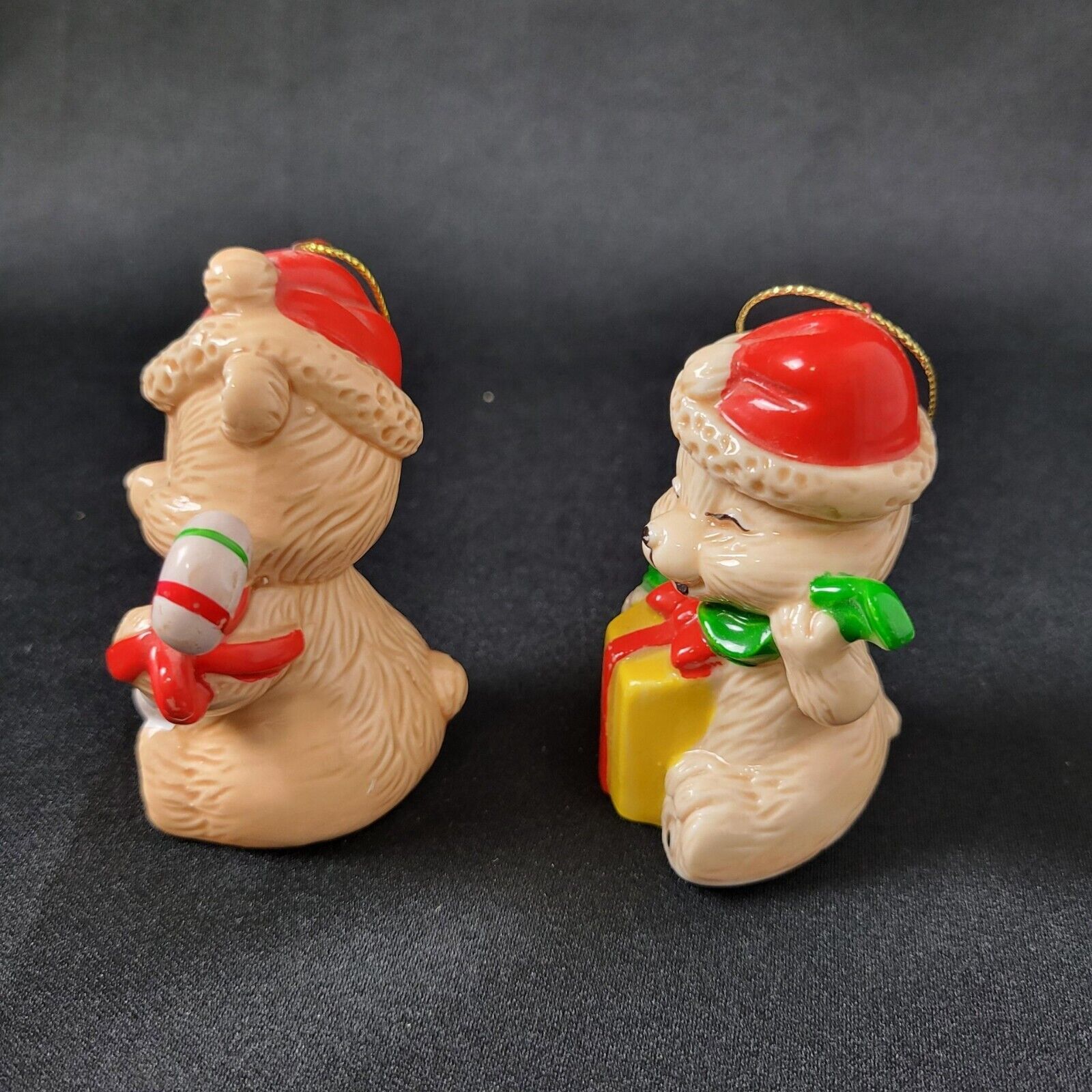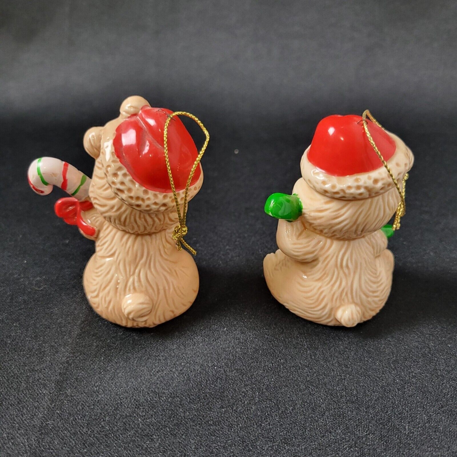 Vintage Christmas Ornament Set Smiling Teddy Bear Candy Cane Hat Ceramic Taiwan