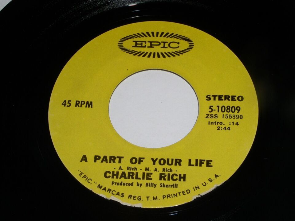 This is an original, vintage 45 rpm phonograph record by Charlie Rich entitled, "A Part Of Your Life". Flipside: "How Long Have You Had Him On Your Mind". Record label Epic 5-10809. "Not For Sale" sticker on label but it's not the promotional issue.