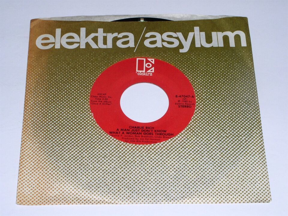 This is an original, vintage 45 rpm phonograph record by Charlie Rich entitled, "A Man Just Don't Know What A Woman Goes Through". Flipside: "Marie". Record label Elektra E-47047. Comes with its original Elektra Records paper sleeve as shown.