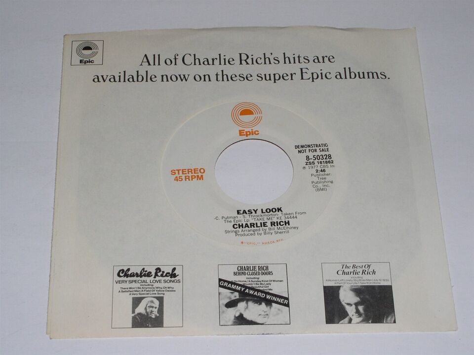 This is an original, vintage promotional 45 rpm phonograph record by Charlie Rich entitled, "Easy Look". This is the mono/stereo issue. Record label Epic 8-50328. Comes with its original Epic Records, Charlie Rich discography sleeve as shown.
