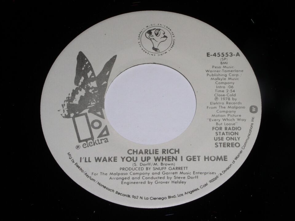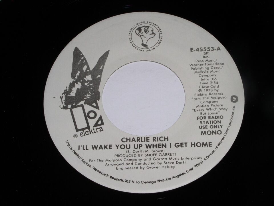 This is an original, vintage promotional 45 rpm phonograph record by Charlie Rich entitled, "I'll Wake You Up when I Get Home". Same flipside. Record label Elektra E-45553. Comes with the original Elektra Records paper sleeve as shown.