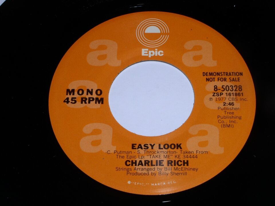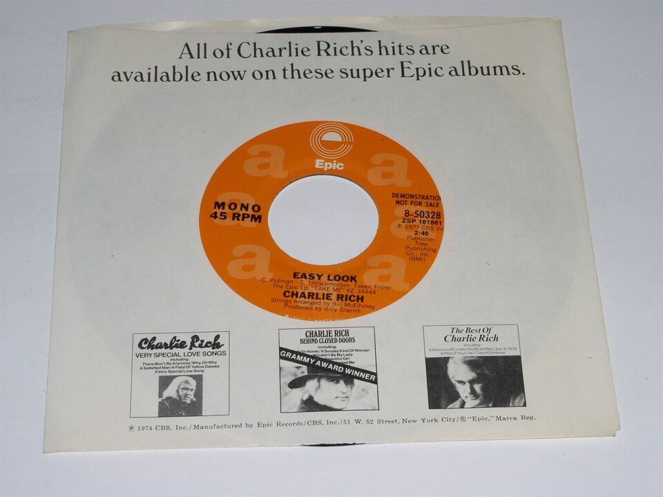 This is an original, vintage promotional 45 rpm phonograph record by Charlie Rich entitled, "Easy Look". This is the mono/stereo issue. Record label Epic 8-50328. Comes with its original Epic Records, Charlie Rich discography sleeve as shown.