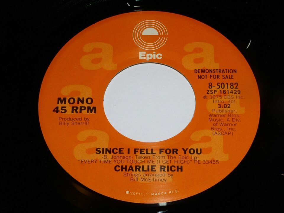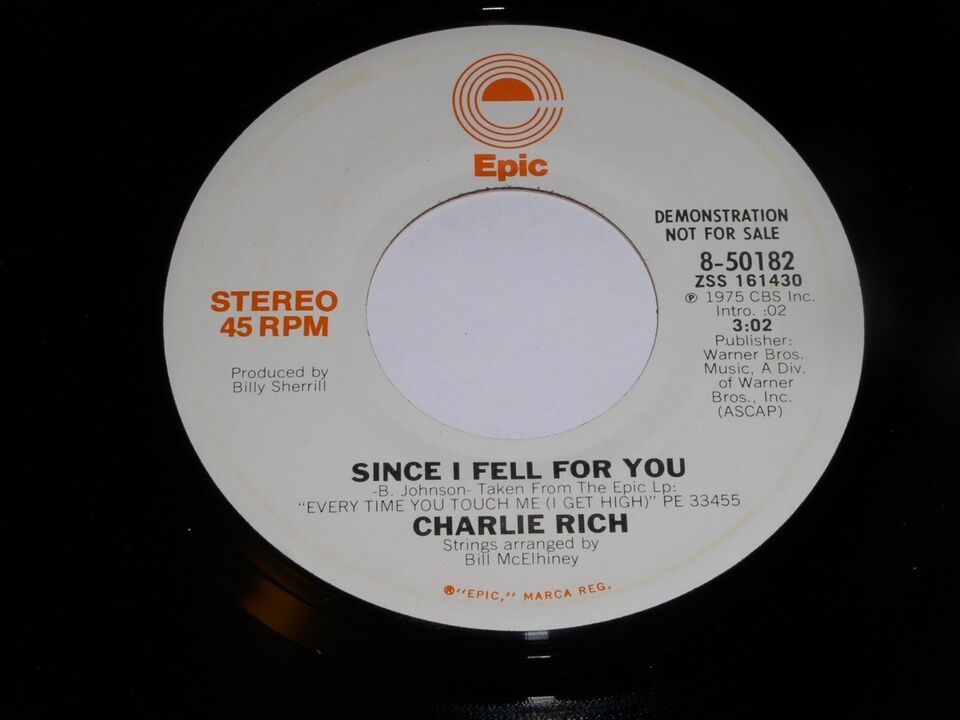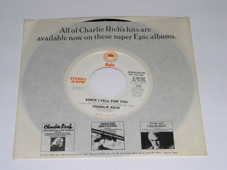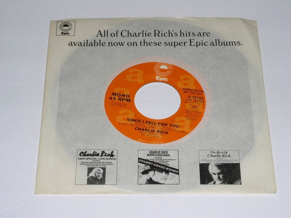 This is an original, vintage promotional 45 rpm phonograph record by Charlie Rich entitled, "Since I Fell For You". This is the mono/stereo issue. Record label Epic 8-50182. Comes with its original Epic Records, Charlie Rich discography paper sleeve as shown.