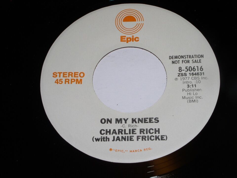 This is an original, vintage promotional 45 rpm phonograph record by Charlie Rich entitled, "On My Knees". This is the mono/stereo issue. Record label Epic 8-50616. Comes with the original, special Charlie Rich paper discography sleeve as shown.
