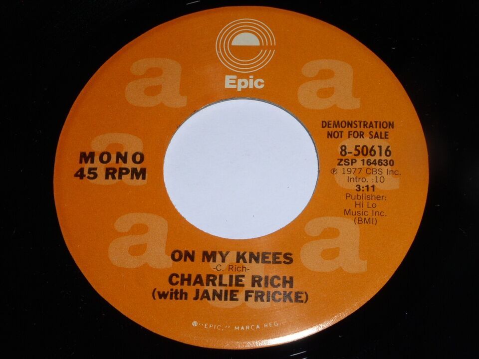This is an original, vintage promotional 45 rpm phonograph record by Charlie Rich entitled, "On My Knees". This is the mono/stereo issue. Record label Epic 8-50616. Comes with the original, special Charlie Rich paper discography sleeve as shown.
