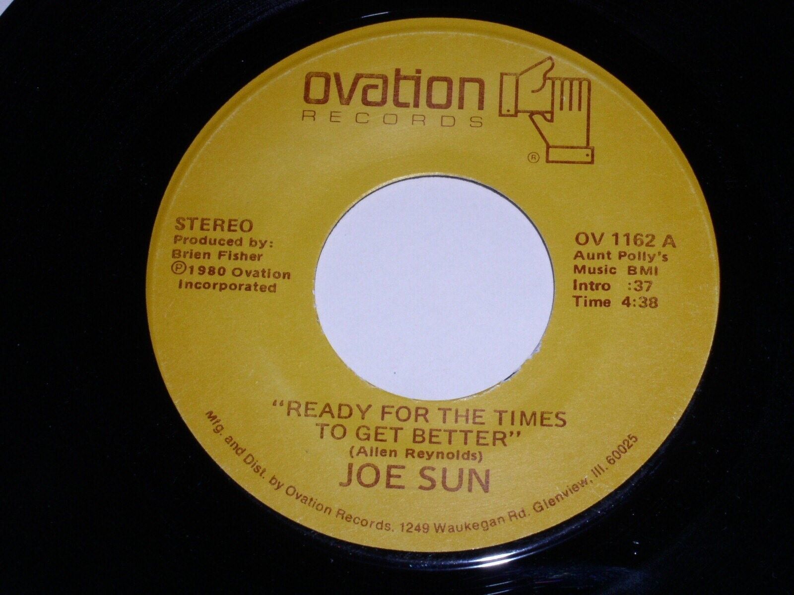 This is a vintage 45 rpm phonograph record by Joe Sun, entitled, "Ready For The Times To Get Better". Flipside: "Bottom Line". Record label: Ovation OV 1162.
