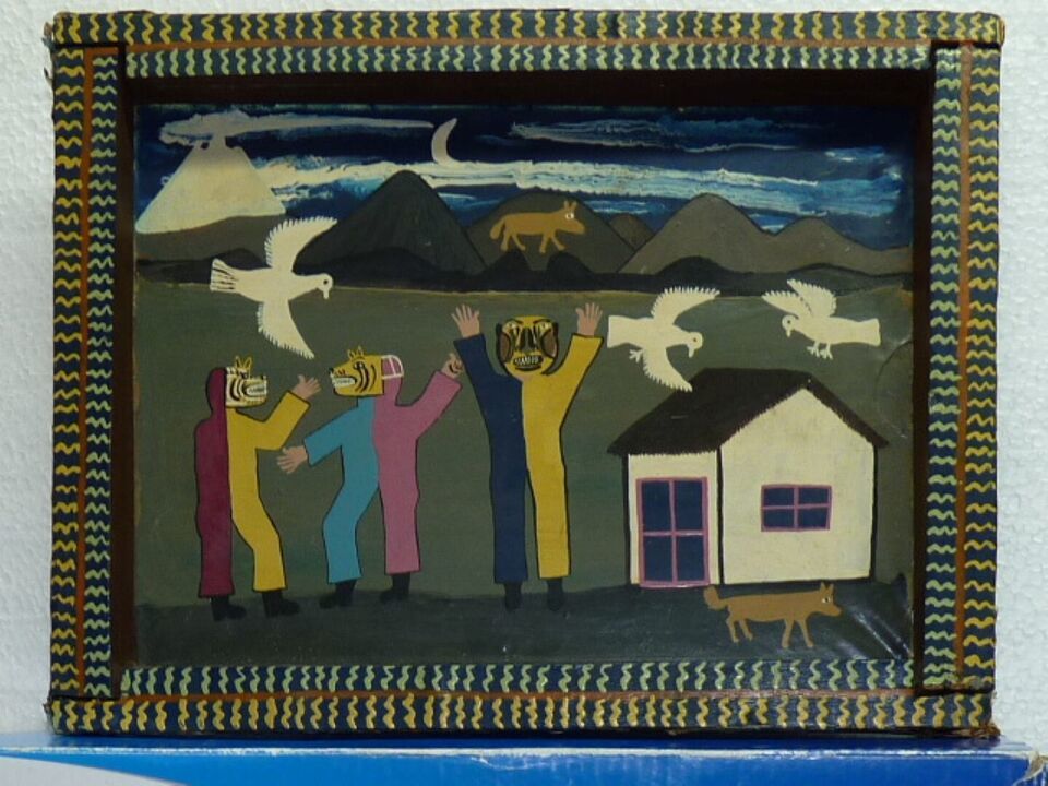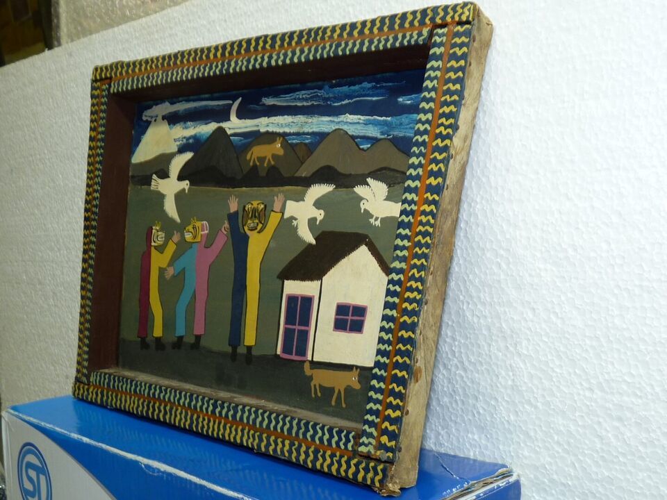 Jose Vega Cuyo Naive Ecuador Art Surrealistic Figures, Acrylic on Hide 18 x 25cm