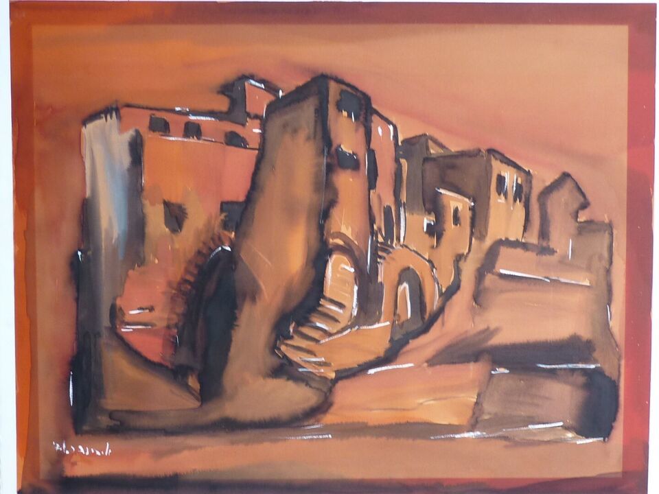 Avraham Binder, Vintage Watercolor Painting "Urban Landscape Scene"