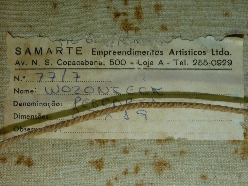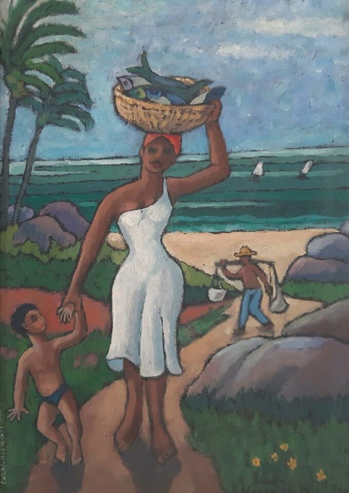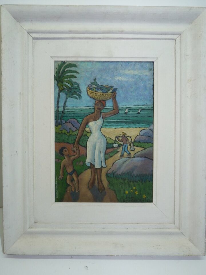 Vintage 74 Brazil Oil Painting Woman w/Basket Fish Copacabana Beach 26 x 18.5 cm