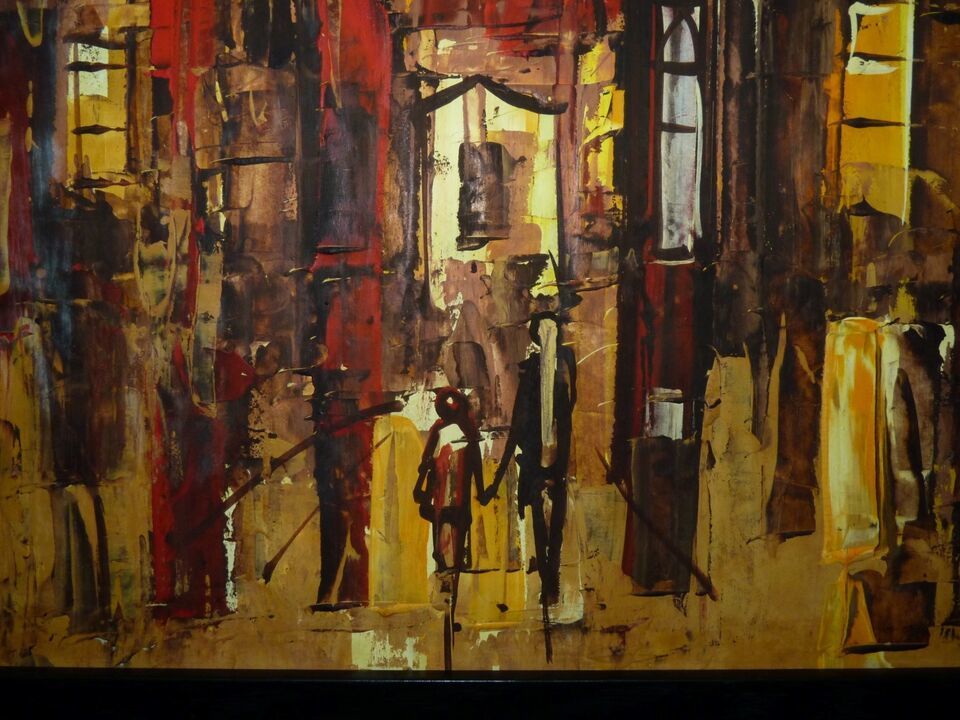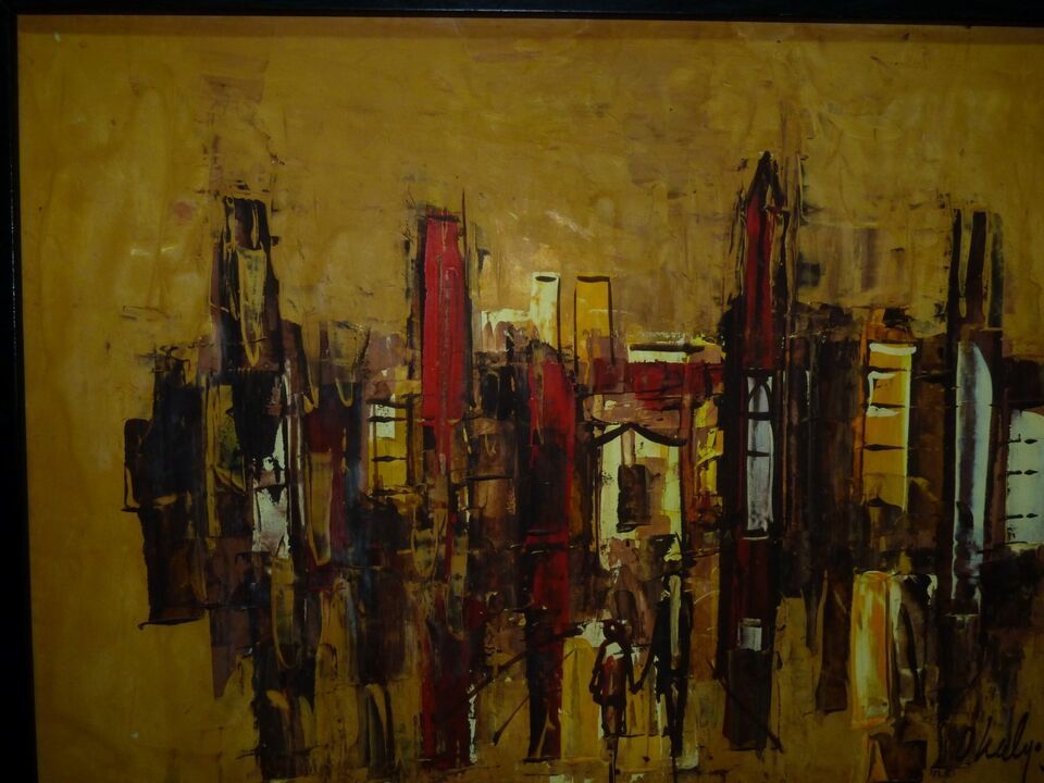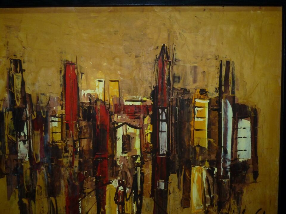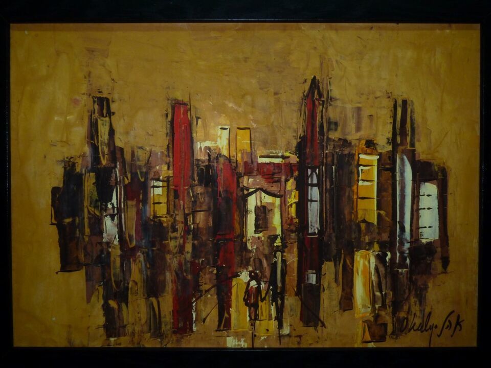 The stark orange-yellow background gives this great abstract oil painting