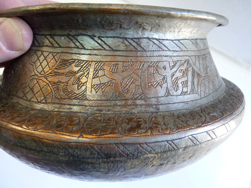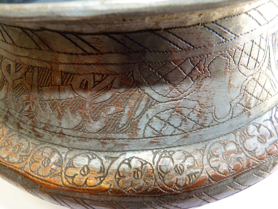 Antique 19C Islamic Copper Vase, Arabesque Writing Engraved Ornamentation D 22cm
