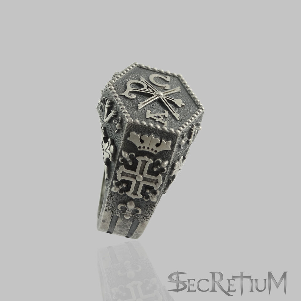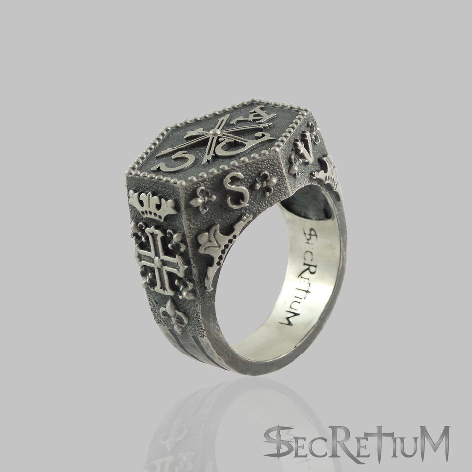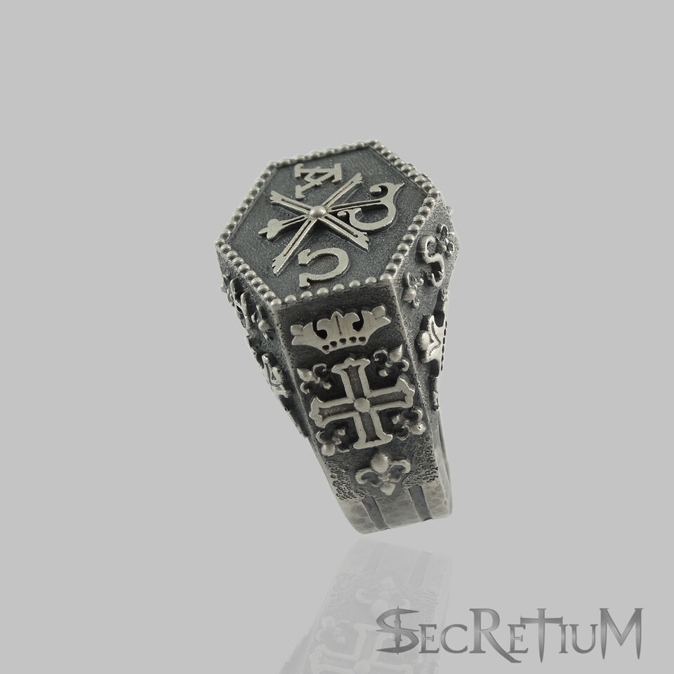 Sterling silver Handmade Knights Templar Masonic/Alfa Omega style men's ring. There is a very detailed and an intricately designed frame which makes the ring an extremely rare and attractive piece. Top of ring features one very identifiable symbol ?Chi Rho? which is used by Roman emperor Constantine I. On each side of it there are the ?Alfa? and ?Omega? initials which are the first and last letters of the Greek alphabet and a title of Christ and God in the Book of Revelation. .
