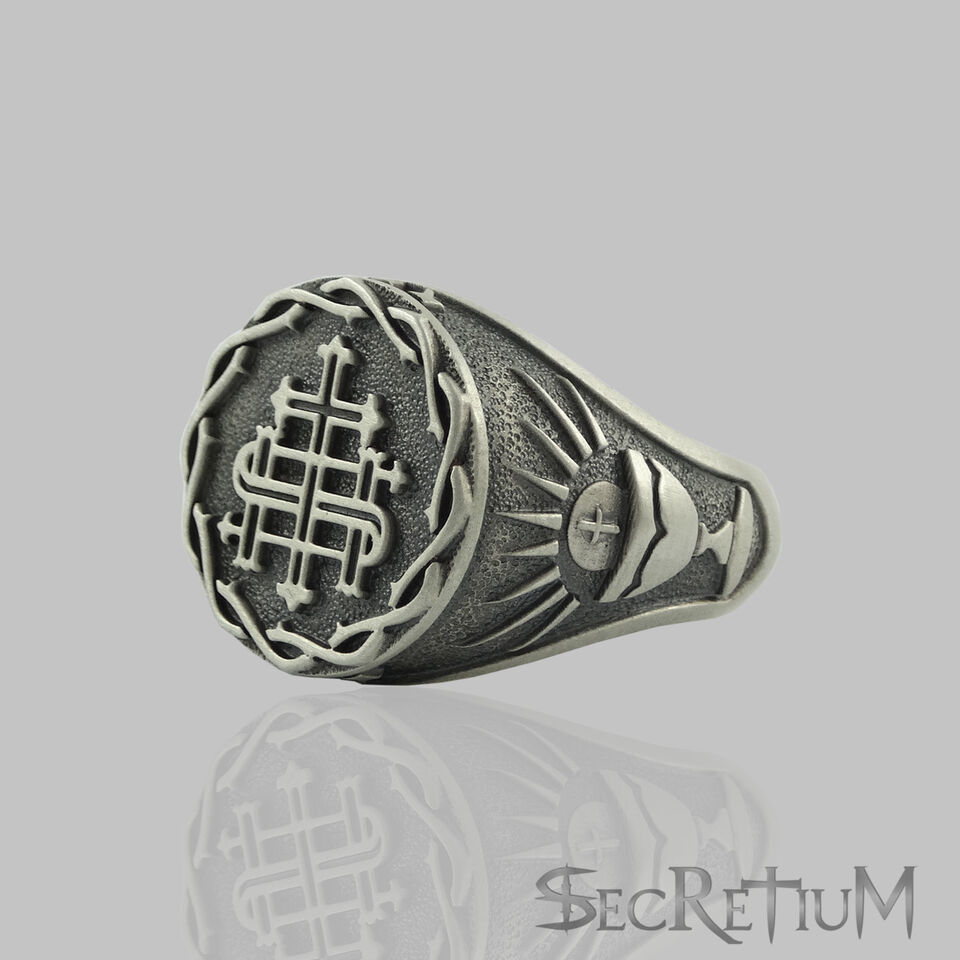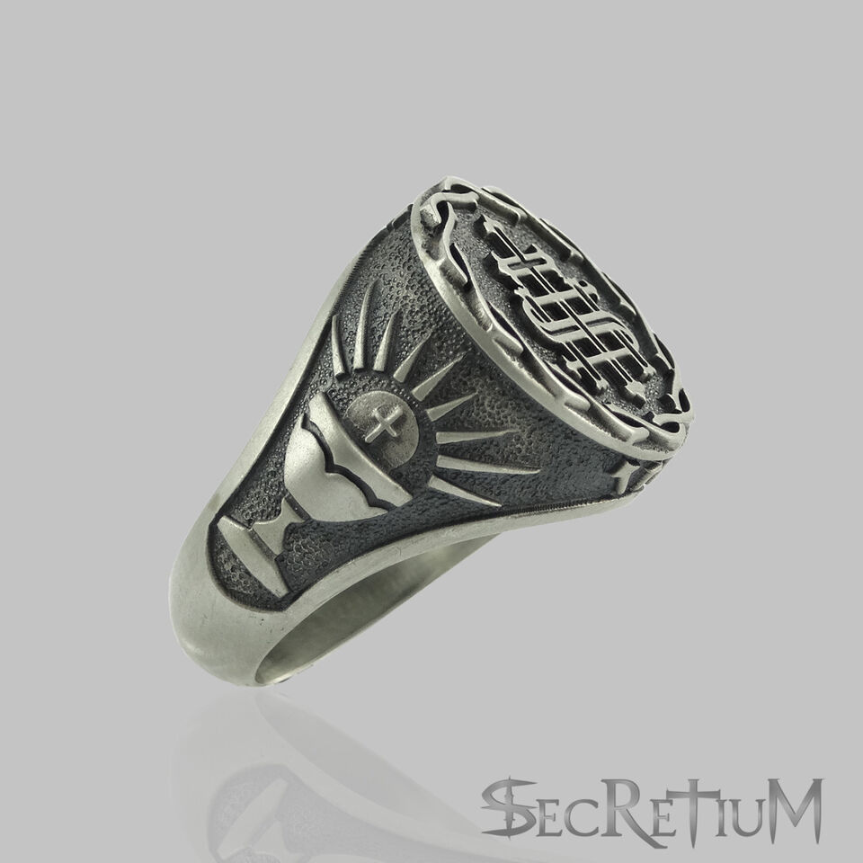 Sterling silver Handmade Jesuit Ring ?IHS? style men's ring. Top of ring features one very identifiable symbol ?IHS? which is used to abbreviate ?the Holy name of Jesus?. The name ?Jesus? in Greek is written as ?ihsous? so, the insignia ?IHS? is the first three letters of the word which, comes from the latinized version of the Greek alphabet. After three nails were added under the insignia some noticed that the inscription now contained a ?V? below the IHS ? so that we see IHSV. In this form it was adopted by St. Ignatius as the symbol of the Jesuits. IHSV was interpreted to mean In Hoc Signo Vinces, ?In this sign, you shall conquer?. On each side of the ring there is The Holy Grail which is an object that serves as an important motif in Arthurian literature. Different versions describe it as a vessel, dish, or stone with miraculous powers providing happiness, eternal youth or food in infinite abundance.