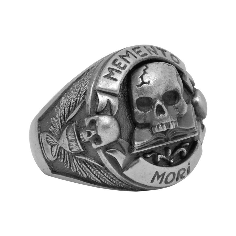 silver custom made ?memento mori? skull men's ring. Top of ring features skull