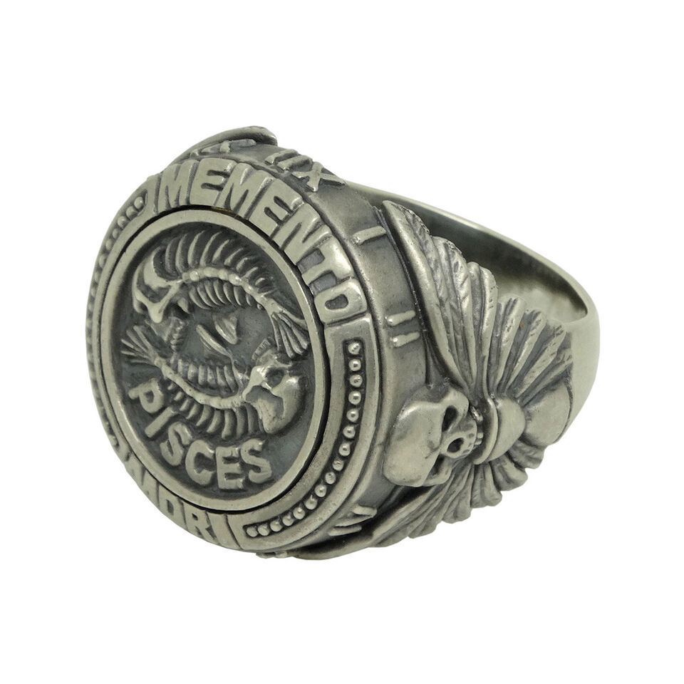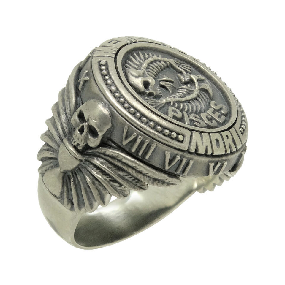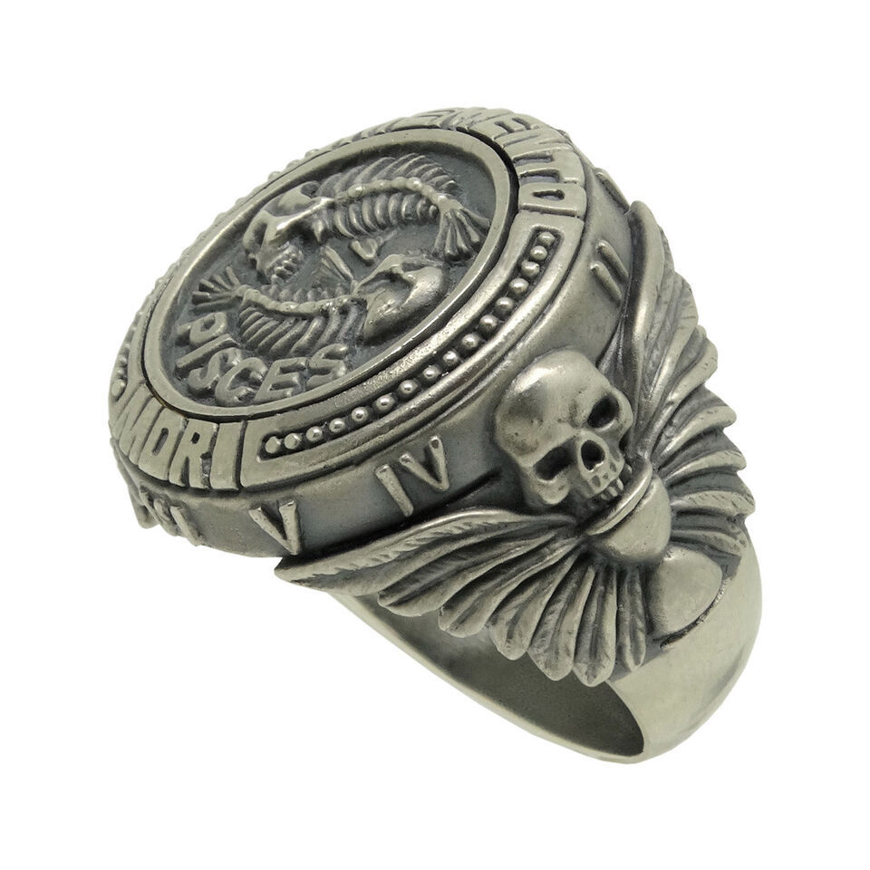 Skull Pisces Zodiac Biker Men's Masonic Sterling Silver Ring Memento Mori