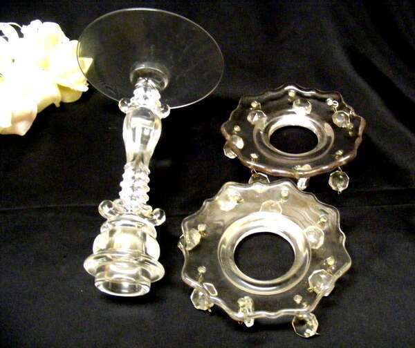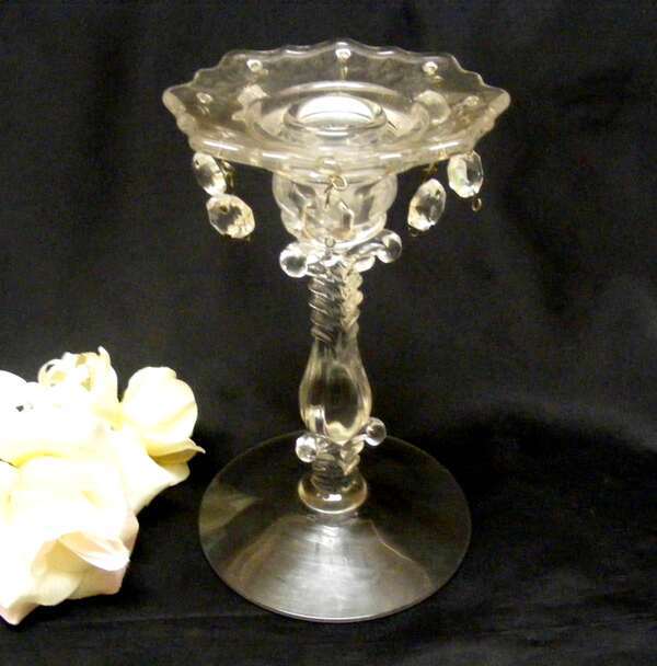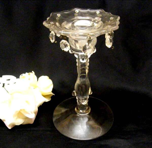 Up for your consideration is a stunning 7" elegant clear glass candleholder with a prism ring that just twinkle. It has a extra twinkling prism ring in case one set gets broken.. This delightful Taper candleholder is made of beautiful clear glass, which makes me think that this might be Duncan Miller glass by its shape. What a unique piece to display in your home that will certainly be the talk of any conversation or give as a cherished gift.