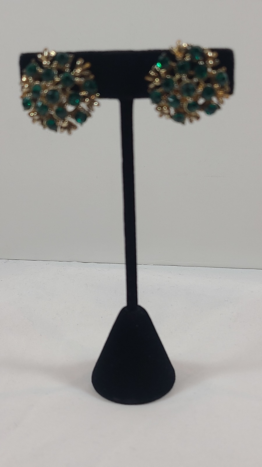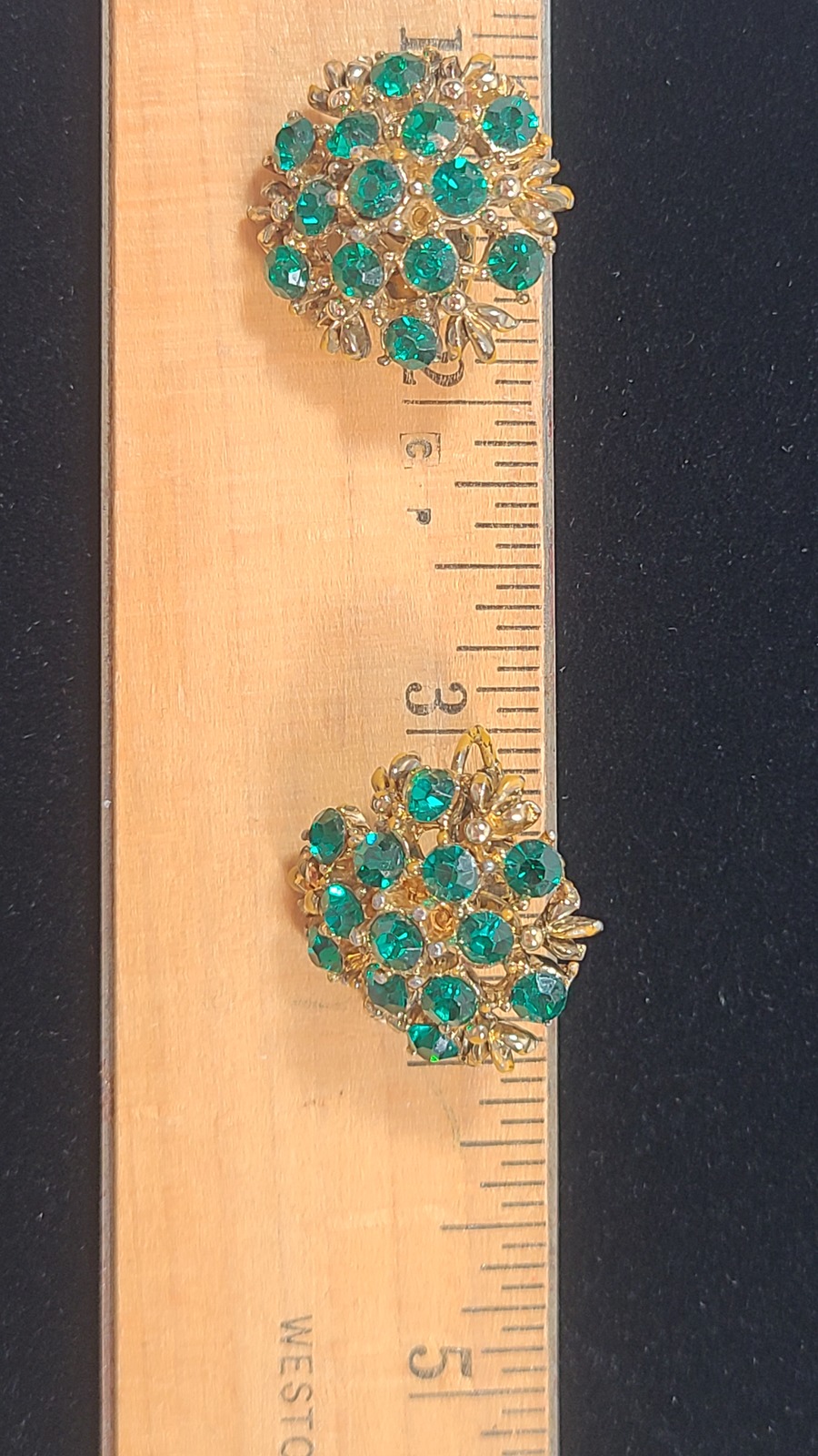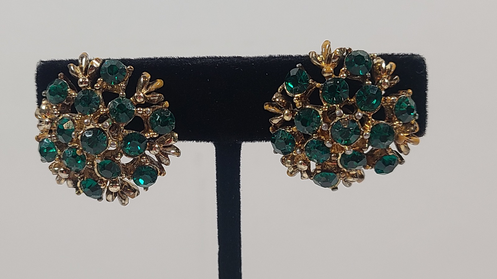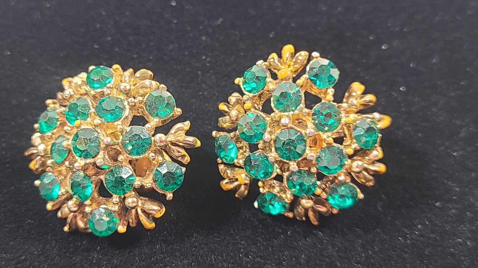 Vintage CORO Gold Tone Clip On Earrings with Emerald Green Colored Stones