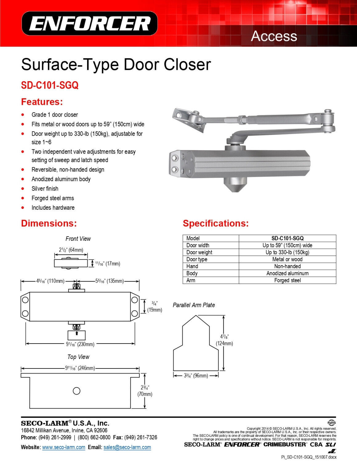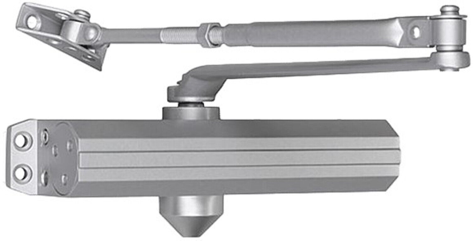 Seco-Larm SD-C101-SGQ Surface-Type Door Closer, Silver Finish, Fits Metal or Wood Doors Up to 59" (150cm) Wide, Grade 1 Door Closer, Door Weight Up to 330-lb (150kg), Adjustable for Size 1~6, Two Independent Valve Adjustments for Easy Setting of Sweep and Latch Speed, Reversible Non-handed Design, Anodized Aluminum Body, Forged Steel Arms, Includes Hardware