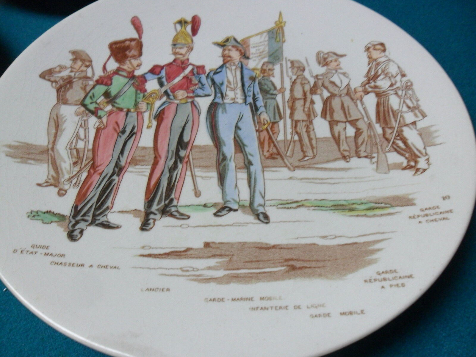Faience Hanging 11 Plates MILITARY Utzschneider Co Sarreguemines Collection France 1870-1920, very good condition, one has a hairline noticed in picture, all plates have the description of the different arms of the military French forces and period on top, 8 1/2" [TOP4redbag]