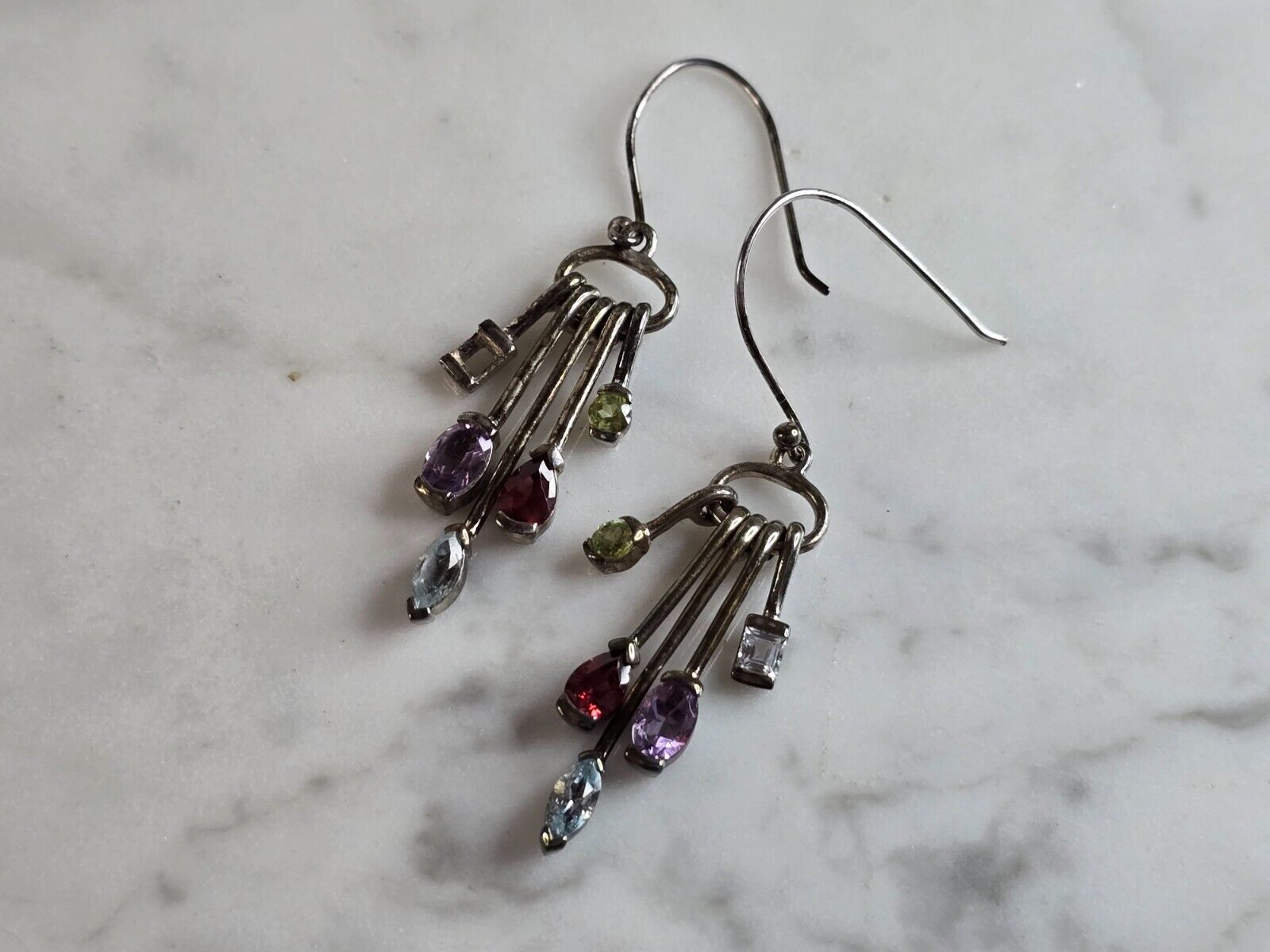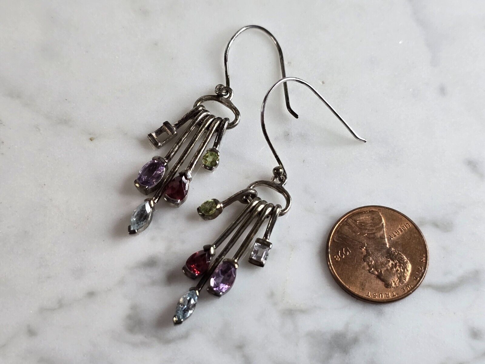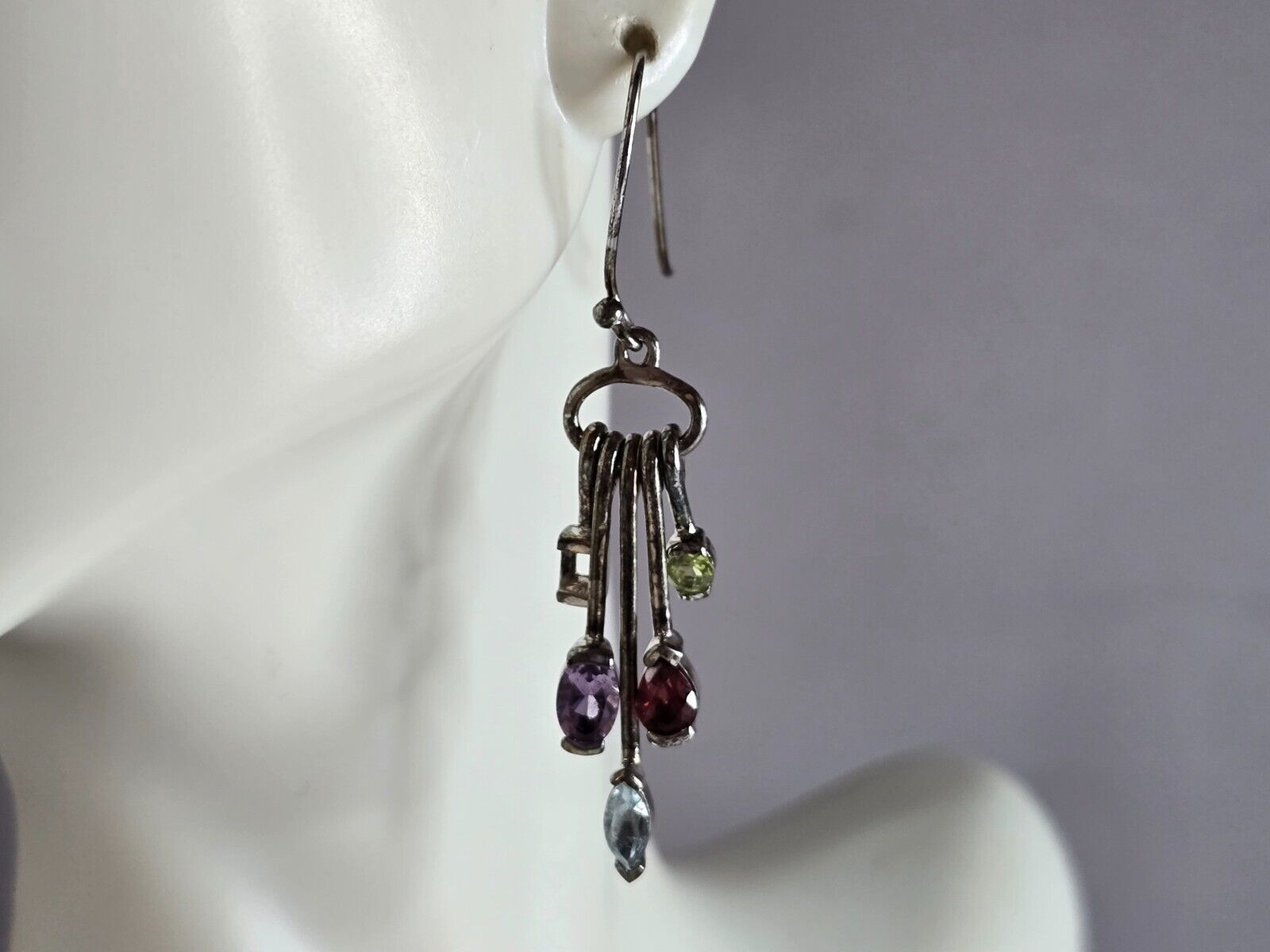 A PAIR OF WOMENS VINTAGE ESTATE STERLING SILVER MODERNIST MULTI STONE EARRINGS THAT WEIGH 6.9g, AND MEASURE 2" LONG BY 3/8" WIDE. NOT SURE IF STONES ARE NATURAL OR MAN MADE. AS YO MAY BE ABLE TO SEE THERE IS ONE STONE MISSING. BUYING AS IS. ANY QUESTIONS, PLEASE DO NOT HESITATE TO ASK. BE SURE TO CHECK OUT SOME OF MY OTHER GREAT ITEMS UP FOR SALE. THANK YOU