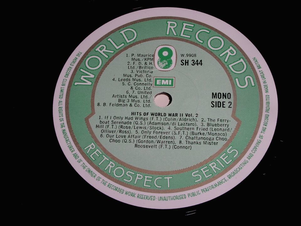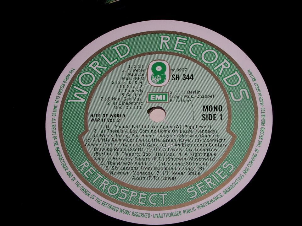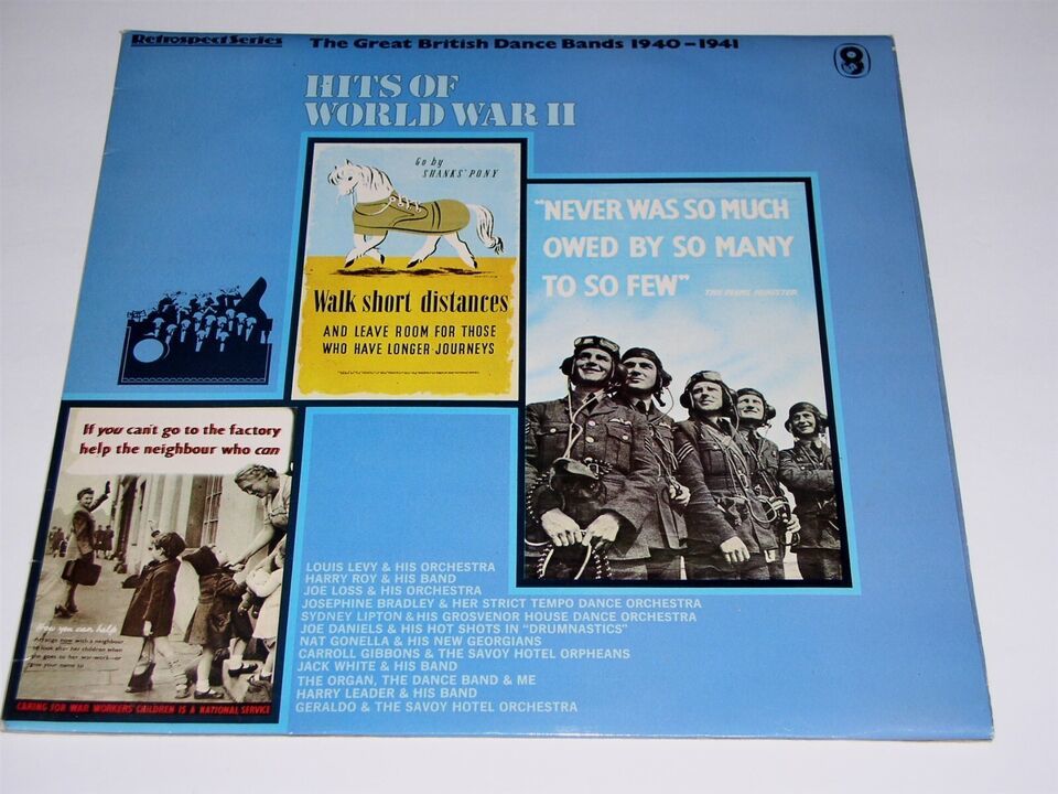 This is a vintage UK import phonograph record album entitled, "Hits Of World War II". The Great British Dance Bands 1940-1941. Retrospect Series. Record label: EMI World Records SH 344. Come with its original EMI Records inner sleeve as shown.