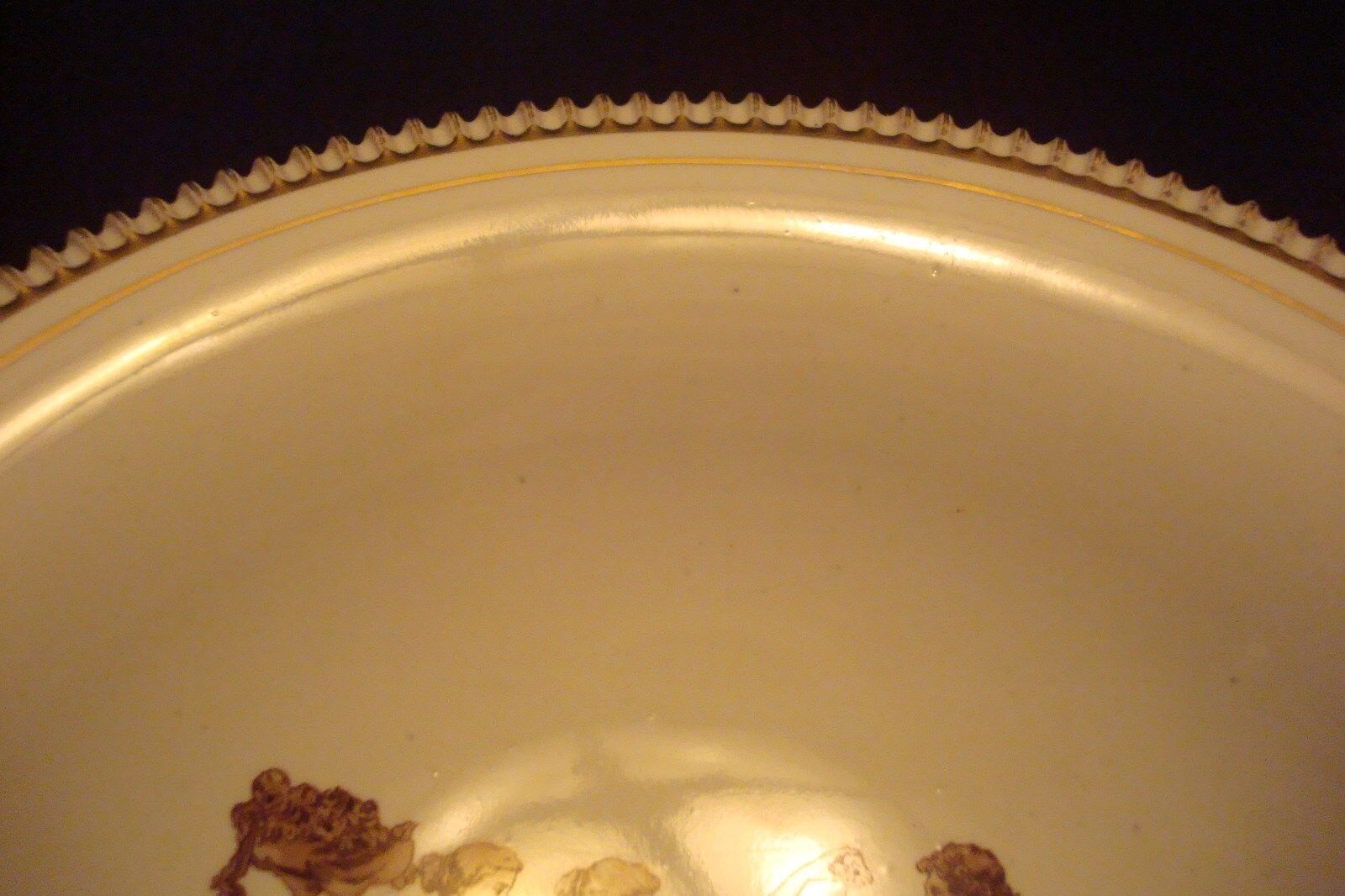 Fiorentine Bowl made in Italy, decorated with Greek figures, gold trim, 6 1/4" diameter by 2 1/2" tall, very good condition, some light scratches commensurate with age.