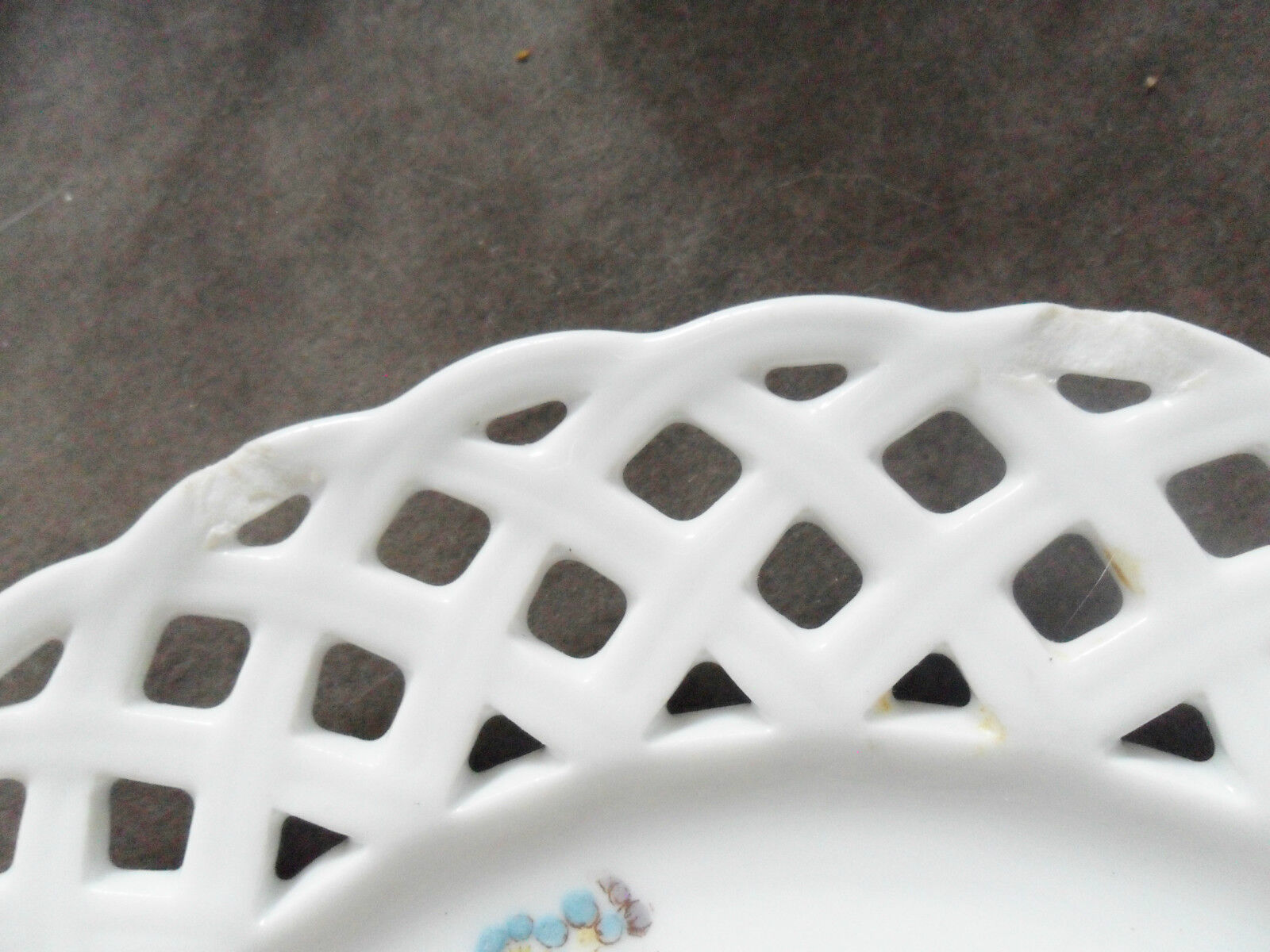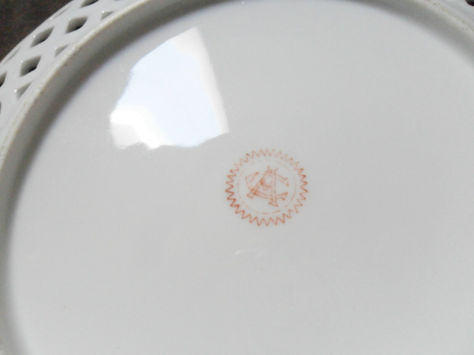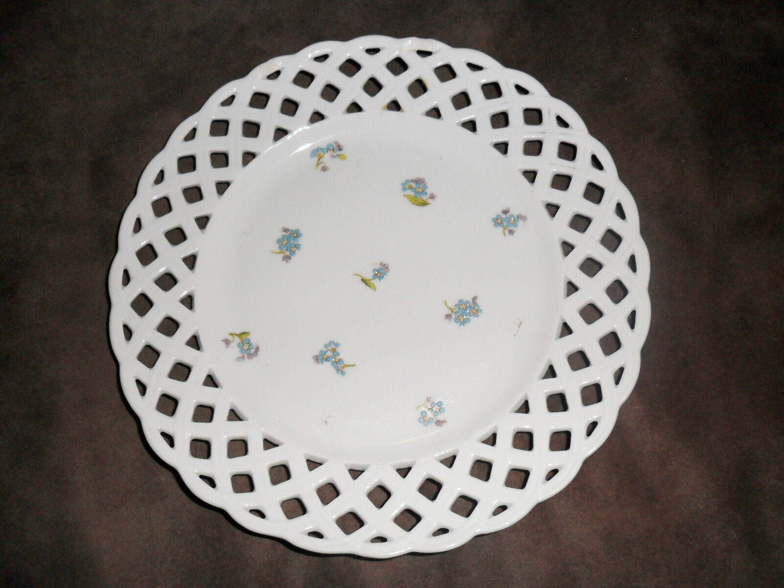 CHARLES AHRENFELDT SON importer on items from Limoges, France - ca 1884 - 1893, 8 beautiful plates, laced borders, size 8 inches diameter. 3 OF THEM HAVE A CHIP ON BORDER, NOTHING SERIOUS. SOME PAINT FADING DUE TO AGE 130 YEARS OLD! Good condition for items over 100 years old. Some light scratches commensurate with age. [FRONTRACK1A]
