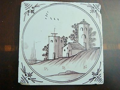 18th century salvaged Delft manganese tile with depictions of country buildings, 5" x 5", some surface scratches, fleabites rough borders and light chips, look at the pictures they are part of the description
