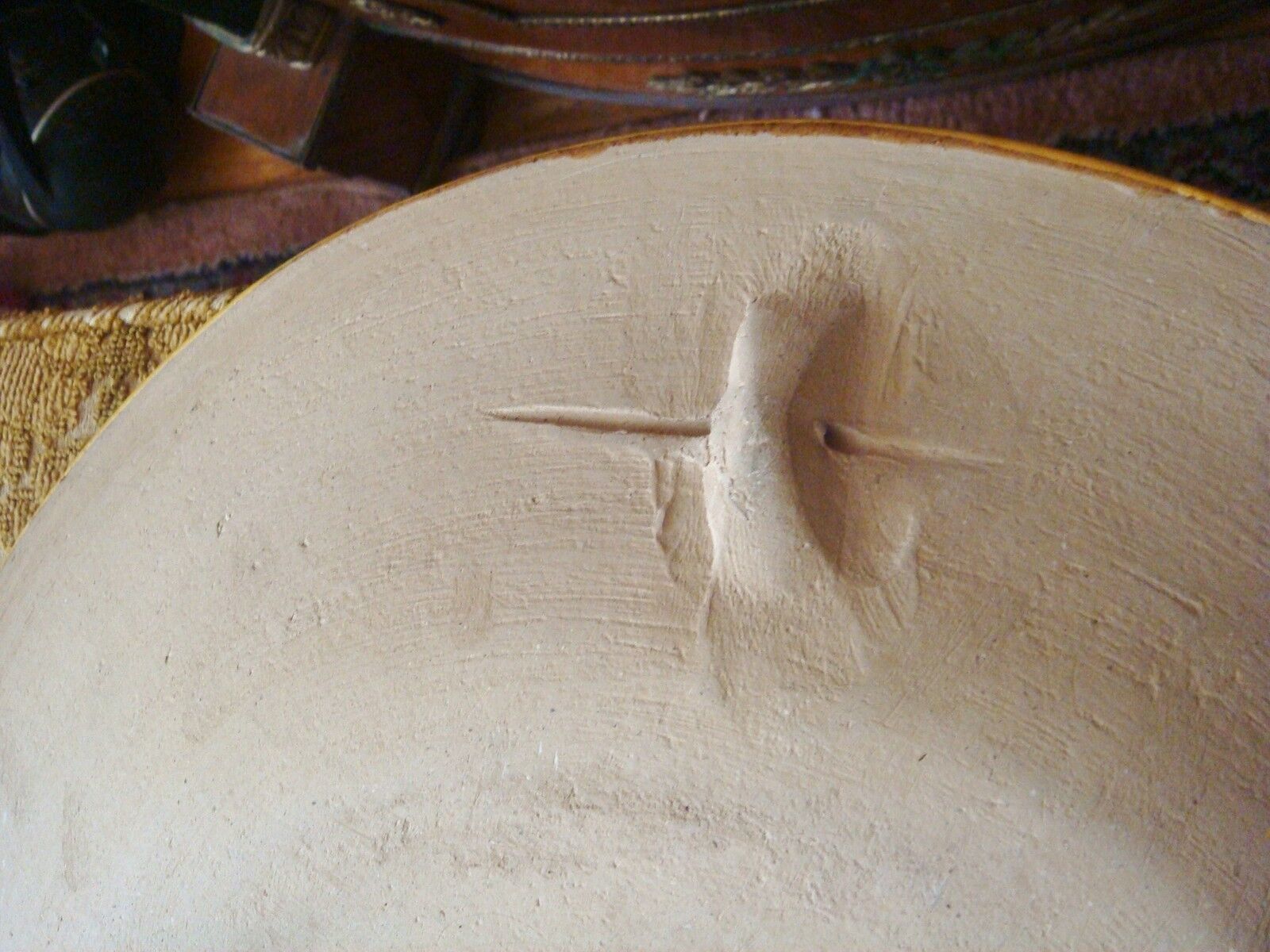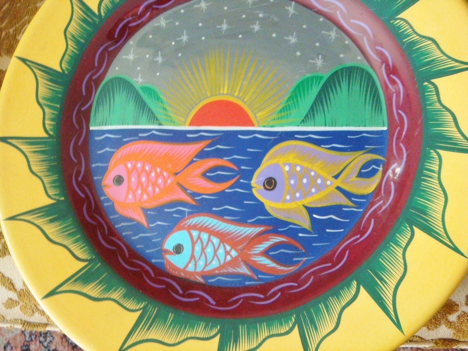 Pottery platter, wall decor, hand painted fishes , sea and sun, very good condition, some light surface scratches commensurate with age, 16" FRONTRACK1TOP