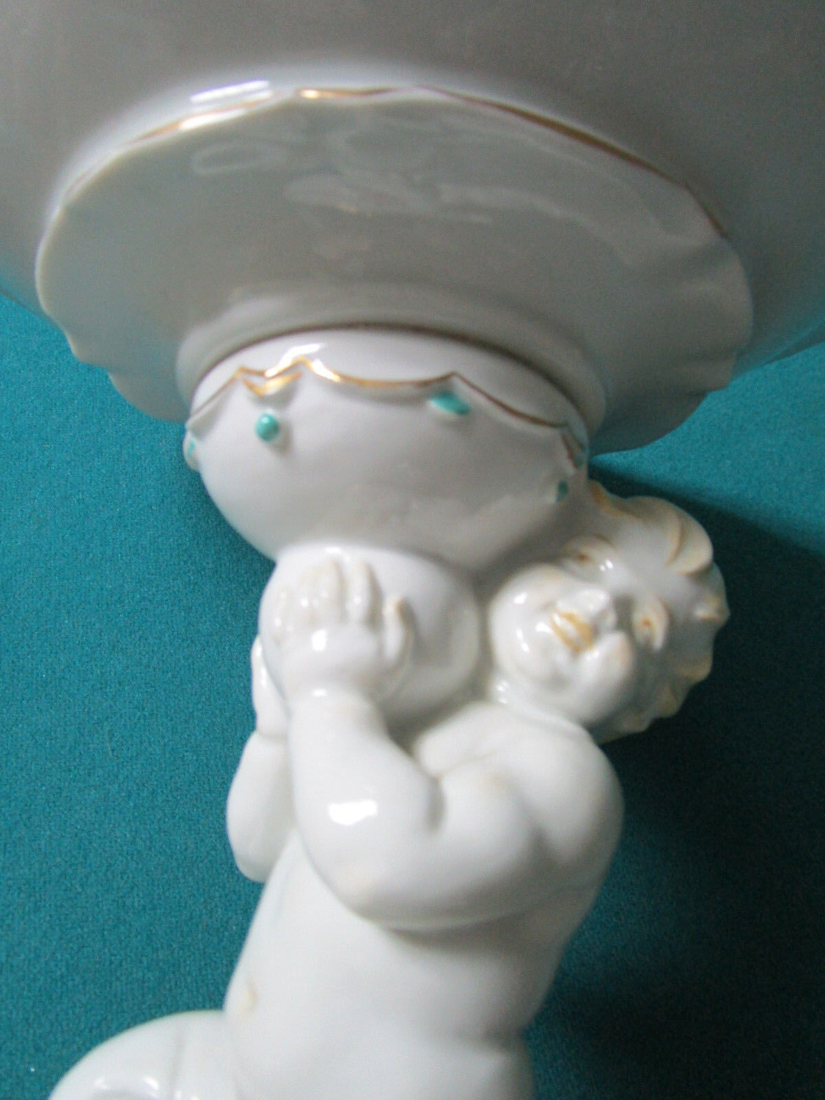 ANTIQUE VOLKSTEDT GERMANY FOOTED COMPOTE ANGEL CENTERPIECE BOWL [*a3] 7 1/2 X 8 1/4" VERY GOOD CONDITION, SOME LIGHT SURFACE SCRATCHES COMMENSURATE WITH AGE