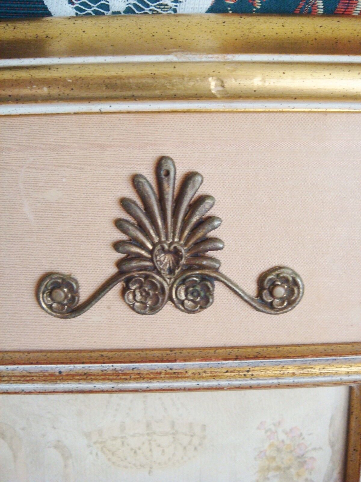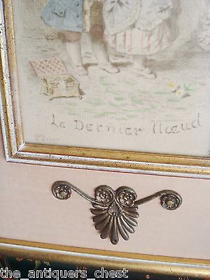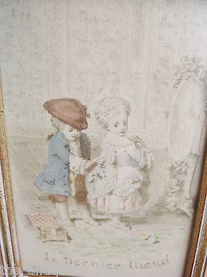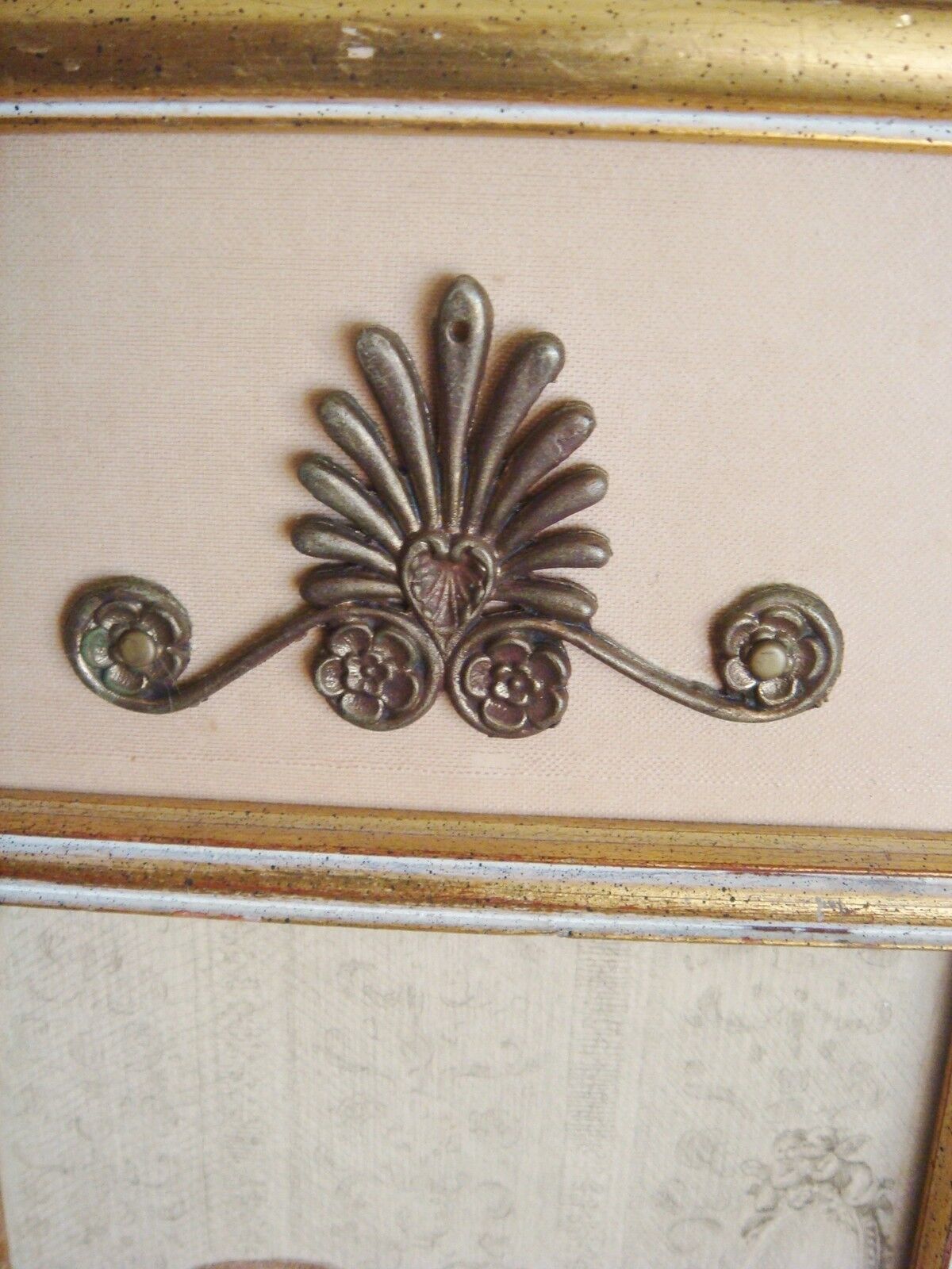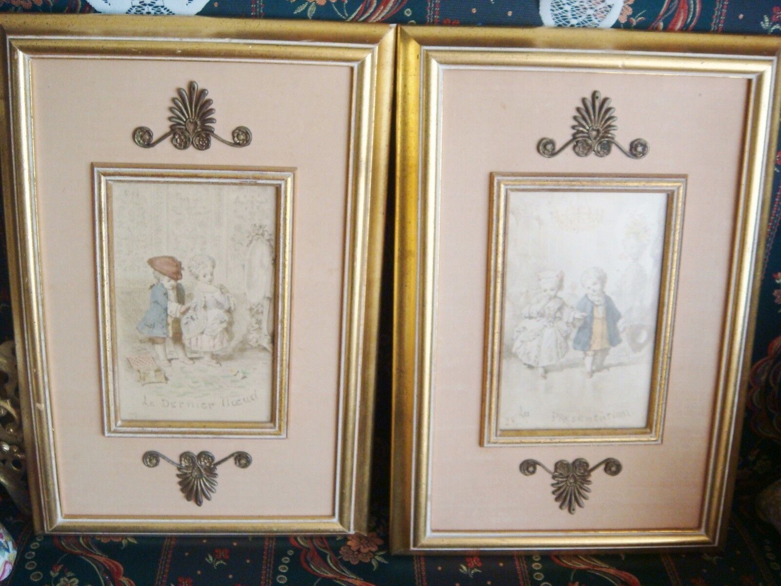 Pair of Vintage French prints "La Presentation" and "La Dernier Moeud", fabric like base, wooden frame and wooden ornaments similar to metal, 15 1/2" x 10", very good condition, back will be covered back with brown paper.