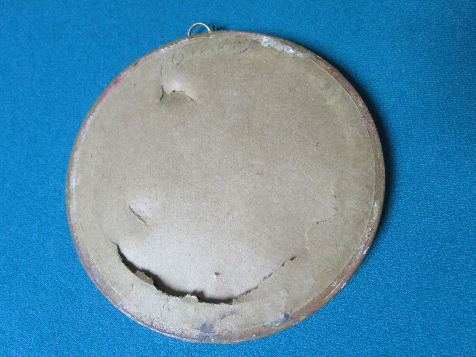 ANTIQUE ROUND COLORED PRINT GOLDEN WOOD FRAME 5 1/4" [*CAMEOS] VERY GOOD CONDITION, SOME LIGHT SURFACE SCRATCHES COMMENSURATE WITH AGE