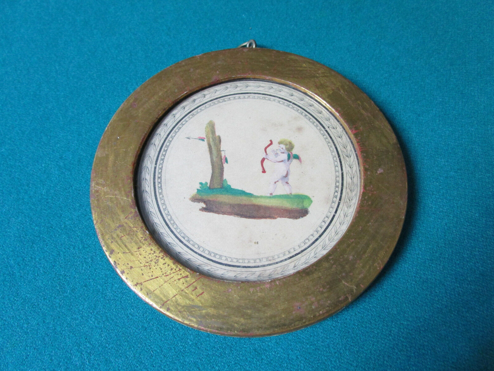ANTIQUE ROUND COLORED PRINT GOLDEN WOOD FRAME 5 1/4" [*CAMEOS]