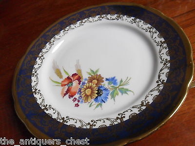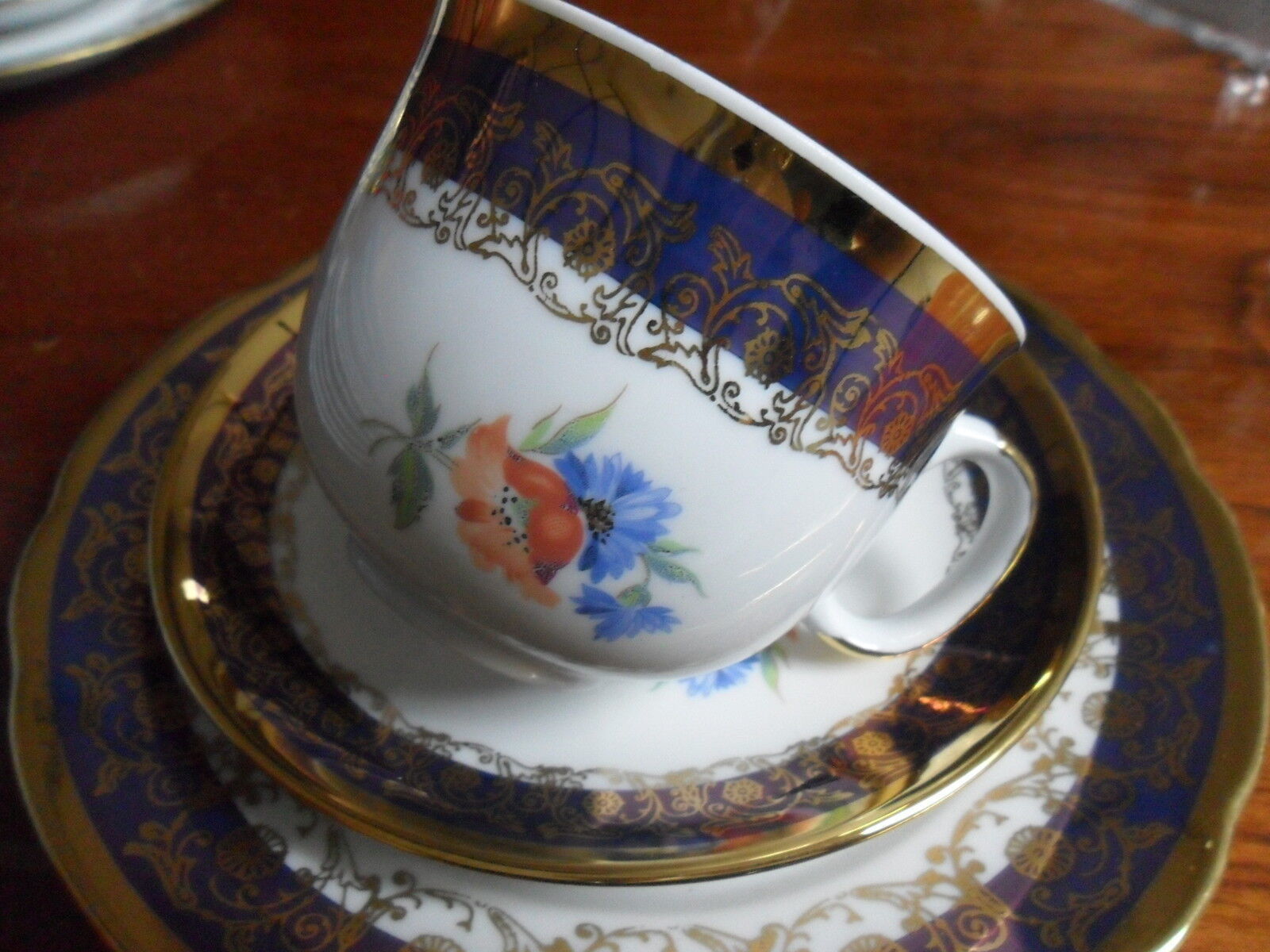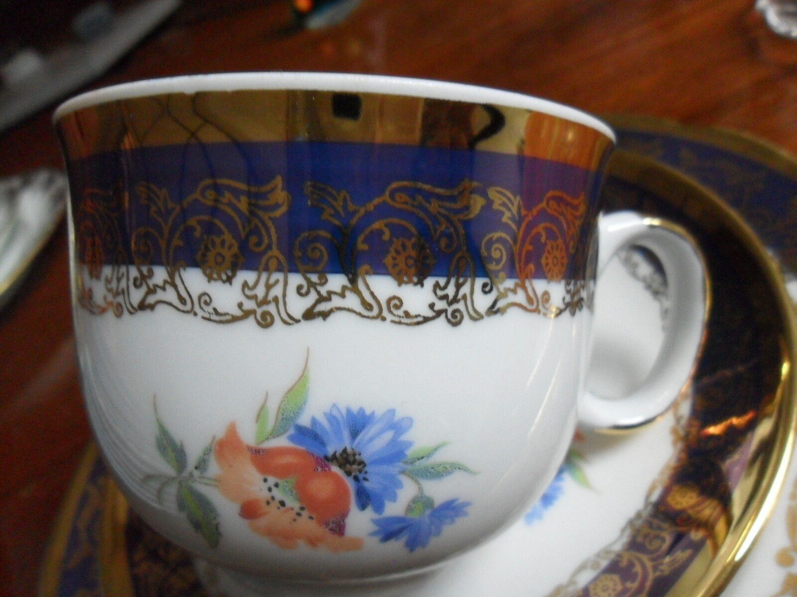 Vintage gold cobalt and flowers trio cup and saucer cup is 2 1/2" x 3 1/4" and saucer is 6" and plate is 7 1/2", very good condition, some light surface scratches commensurate with age
