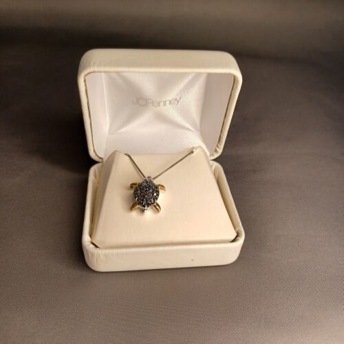 This vintage JcPenney necklace features a stunning black turtle pendant on an 18-inch chain made of fine silver and 14k gold. The pendant is crafted with intricate details and hangs from a delicate chain that is both stylish and comfortable to wear. The necklace is perfect for any occasion and would make a great addition to any jewelry collection.