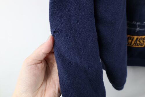 Holes back and sleeves. Color fade. Graphics distressed. USA made. Collar stretched. Boxy wide fit.
