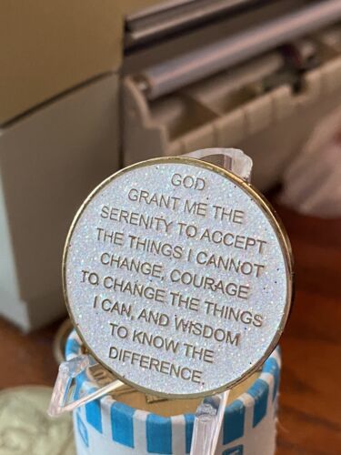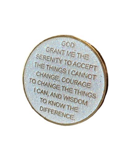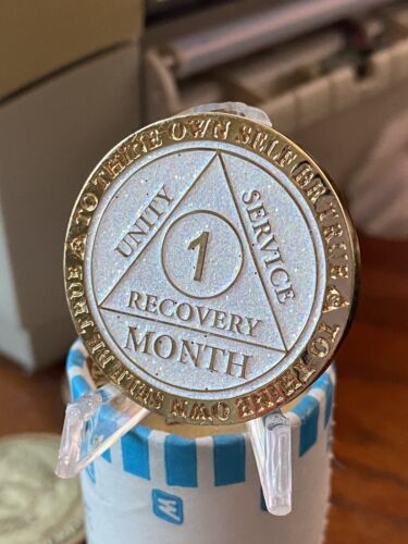 This is a stunning 1-month AA Medallion token that is perfect for those who are looking for a unique and elegant way to commemorate their sobriety. The token is made of high-quality materials, featuring a beautiful white glitter gold plated design that is sure to impress.
