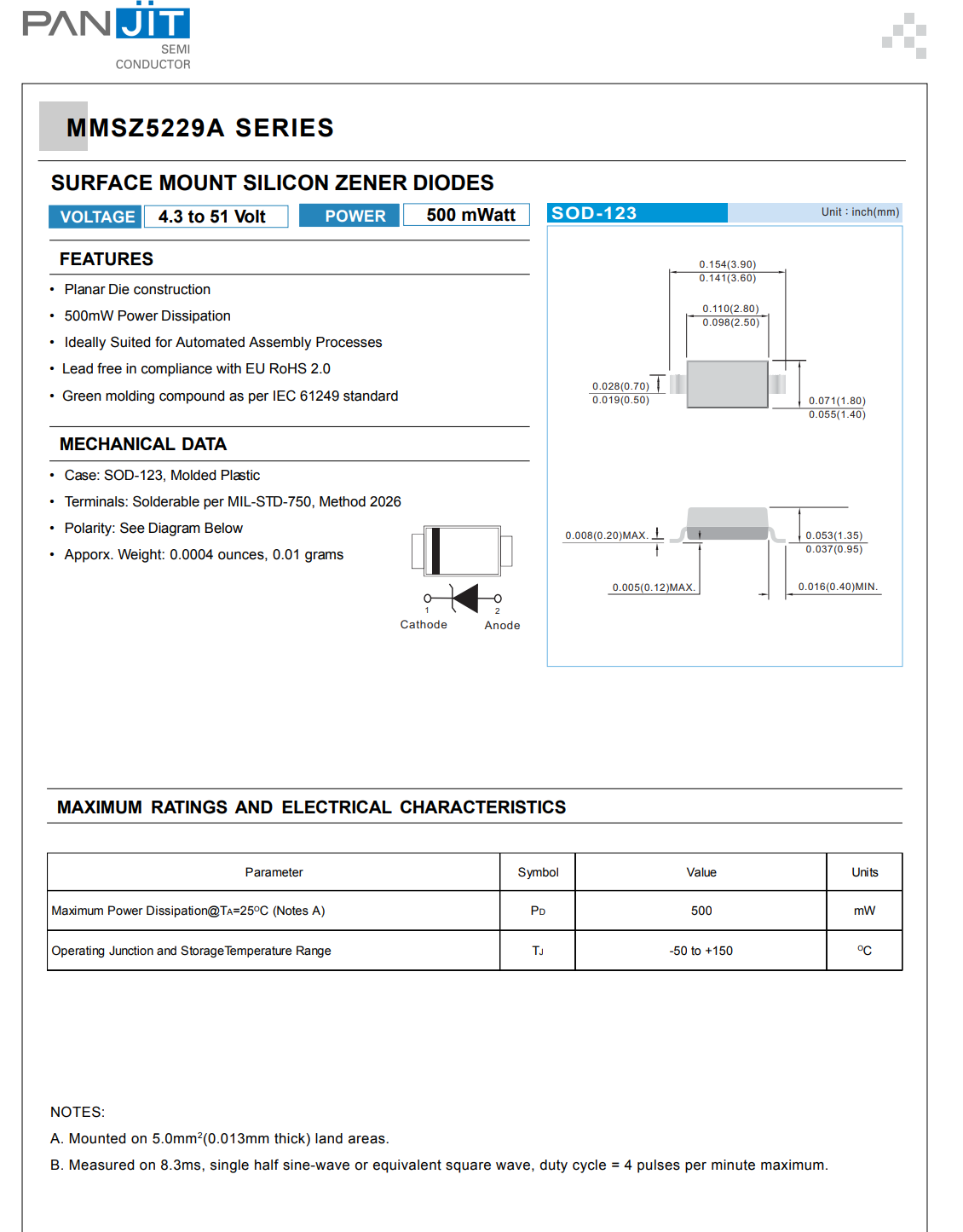 100Pcs MMSZ5246A Panjit SMD Zener Diode 16V 500mW 2% SOD-123 Regulator Diode