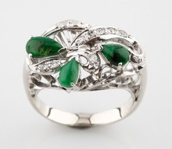 One Electronically tested 10k white gold ladies cast jadeite diamond ring. Condition is good. Decorated with three pear shaped cabochon jadeite Curling diamond scrolls. Bright polish finish.